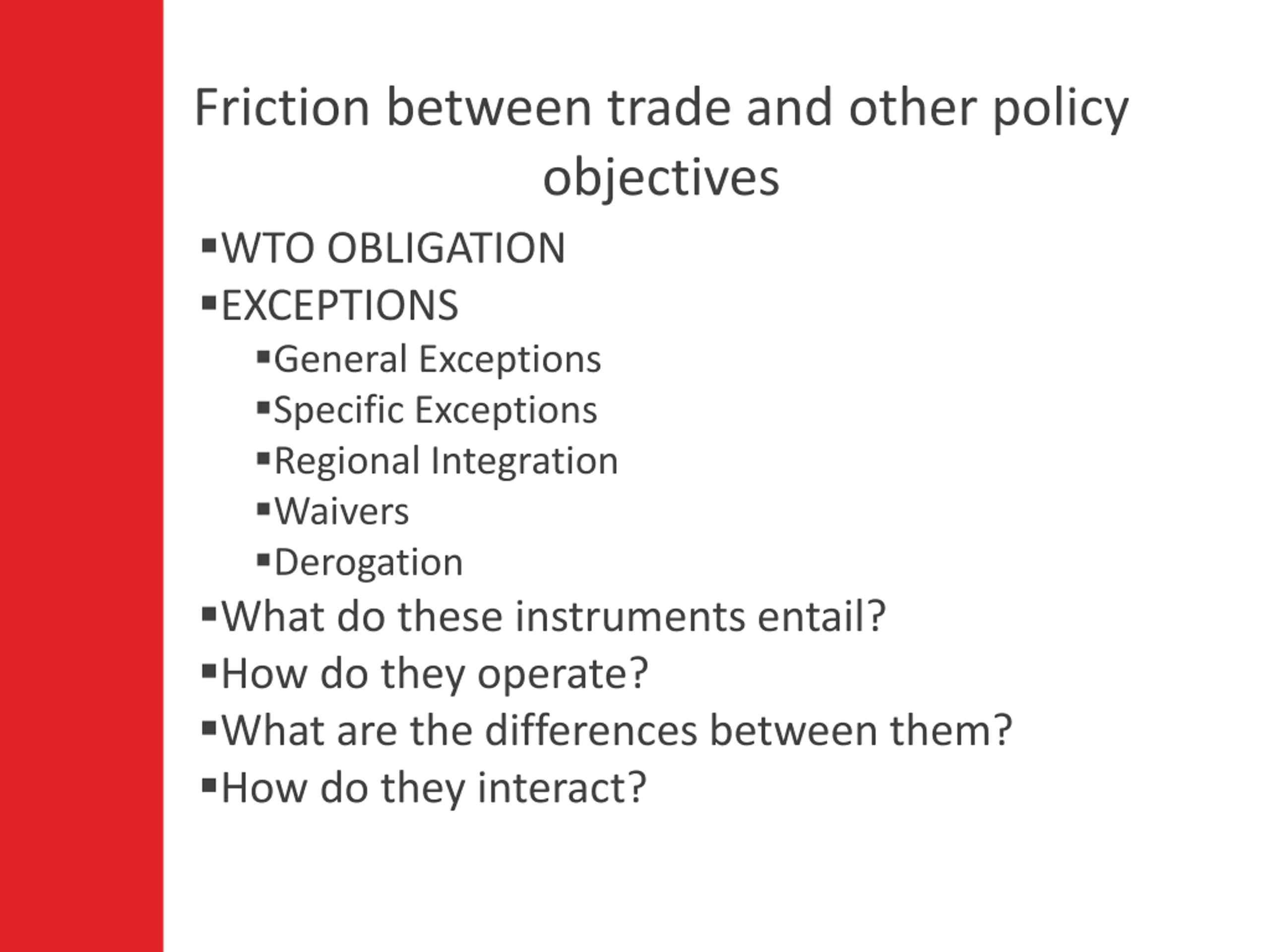 Friction between trade and other policy objectives WTO OBLIGATION EXCEPTIONS General Exceptions Specific Exceptions Regional Integration Waivers Derogation What do these instruments entail? How do they operate? What are the differences between them? How do they interact?