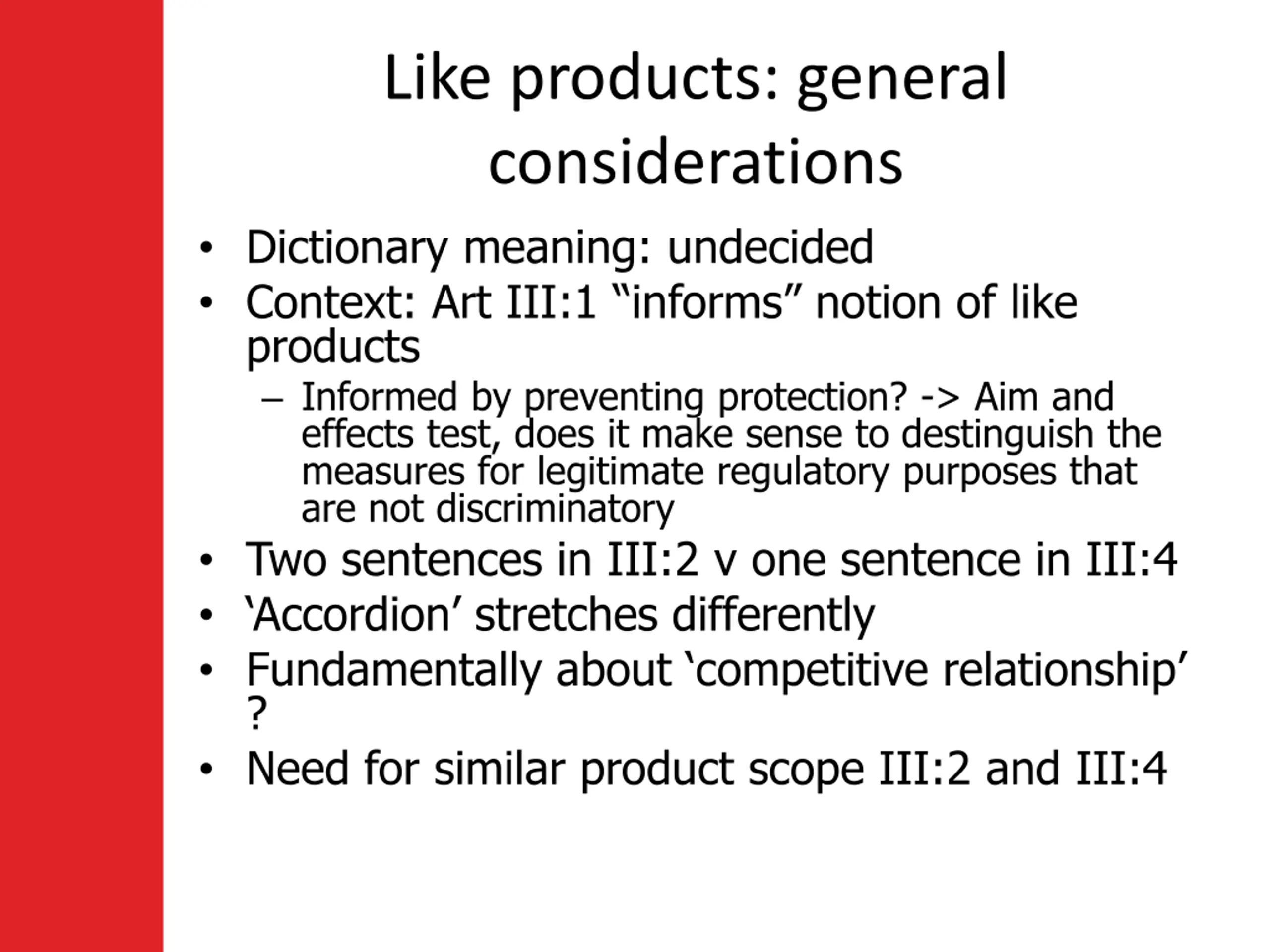 Like products: general considerations Dictionary meaning: undecided Context: Art III:1 informs notion of like products Informed by preventing protection? -> Aim and effects test, does it make sense to destinguish the measures for legitimate regulatory purposes that are not discriminatory Two sentences in III:2 v one sentence in III:4 Accordion stretches differently Fundamentally about competitive relationship ? Need for similar product scope III:2 and III:4