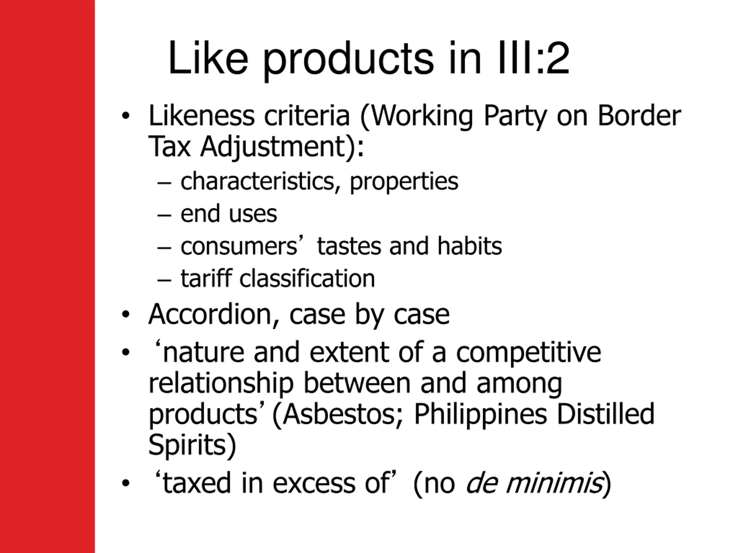 Like products in III:2 Likeness criteria (Working Party on Border Tax Adjustment): characteristics, properties end uses consumers tastes and habits tariff classification Accordion, case by case nature and extent of a competitive relationship between and among products (Asbestos; Philippines Distilled Spirits) taxed in excess of (no de minimis)