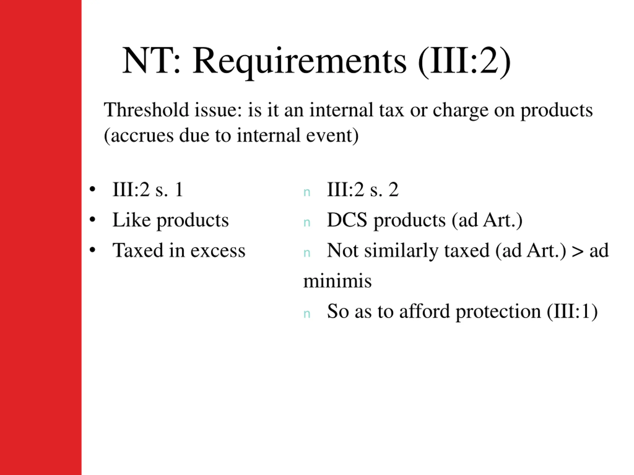 NT: Requirements (III:2) Threshold issue: is it an internal tax or charge on products (accrues due to internal event) III:2 s. 1 Like products Taxed in excess n III:2 s. 2 n DCS products (ad Art.) n Not similarly taxed (ad Art.) > ad minimis n So as to afford protection (III:1)