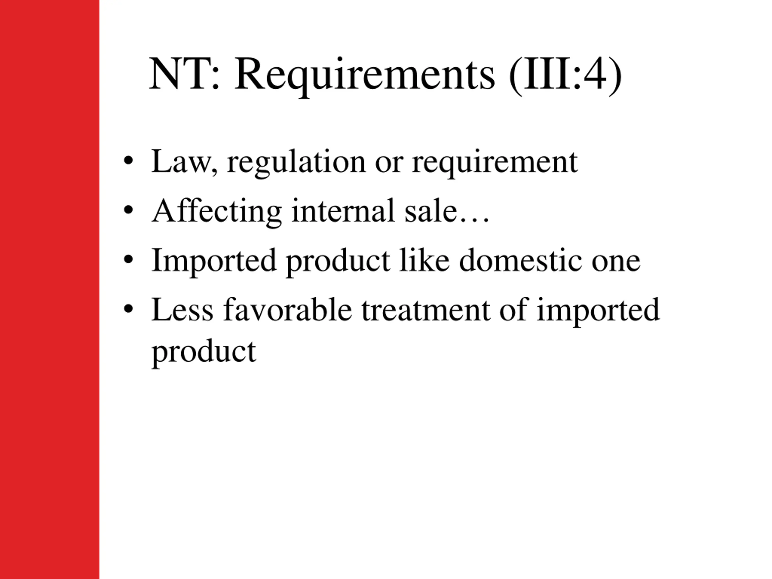 NT: Requirements (III:4) Law, regulation or requirement Affecting internal sale Imported product like domestic one Less favorable treatment of imported product