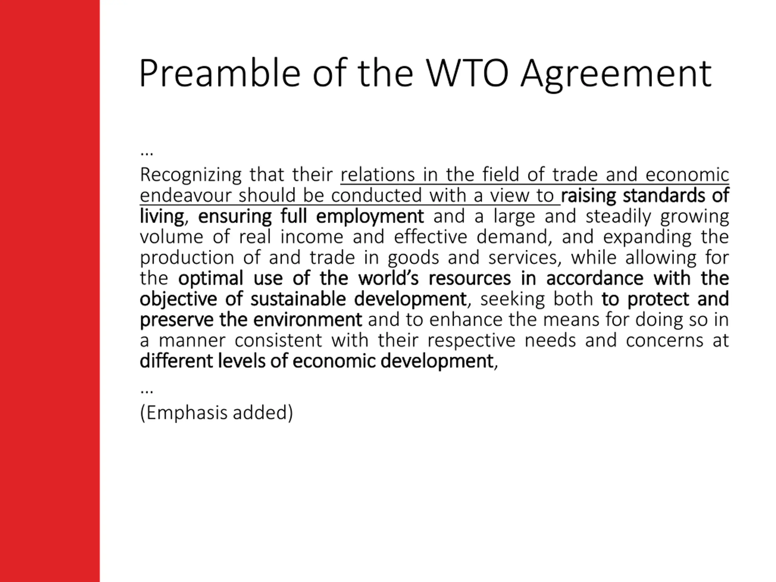 Preamble of the WTO Agreement Recognizing that their relations in the field of trade and economic endeavour should be conducted with a view to raising living living, ensuring ensuring full full employment employment and a large and steadily growing volume of real income and effective demand, and expanding the production of and trade in goods and services, while allowing for the optimal optimal use use of of the the world s world s resources resources in in accordance objective objective of of sustainable sustainable development development, seeking both to to protect preserve preserve the the environment environment and to enhance the means for doing so in a manner consistent with their respective needs and concerns at different different levels levelsof of economic economic development development, (Emphasis added) raising standards standards of of accordance with with the protect and the and