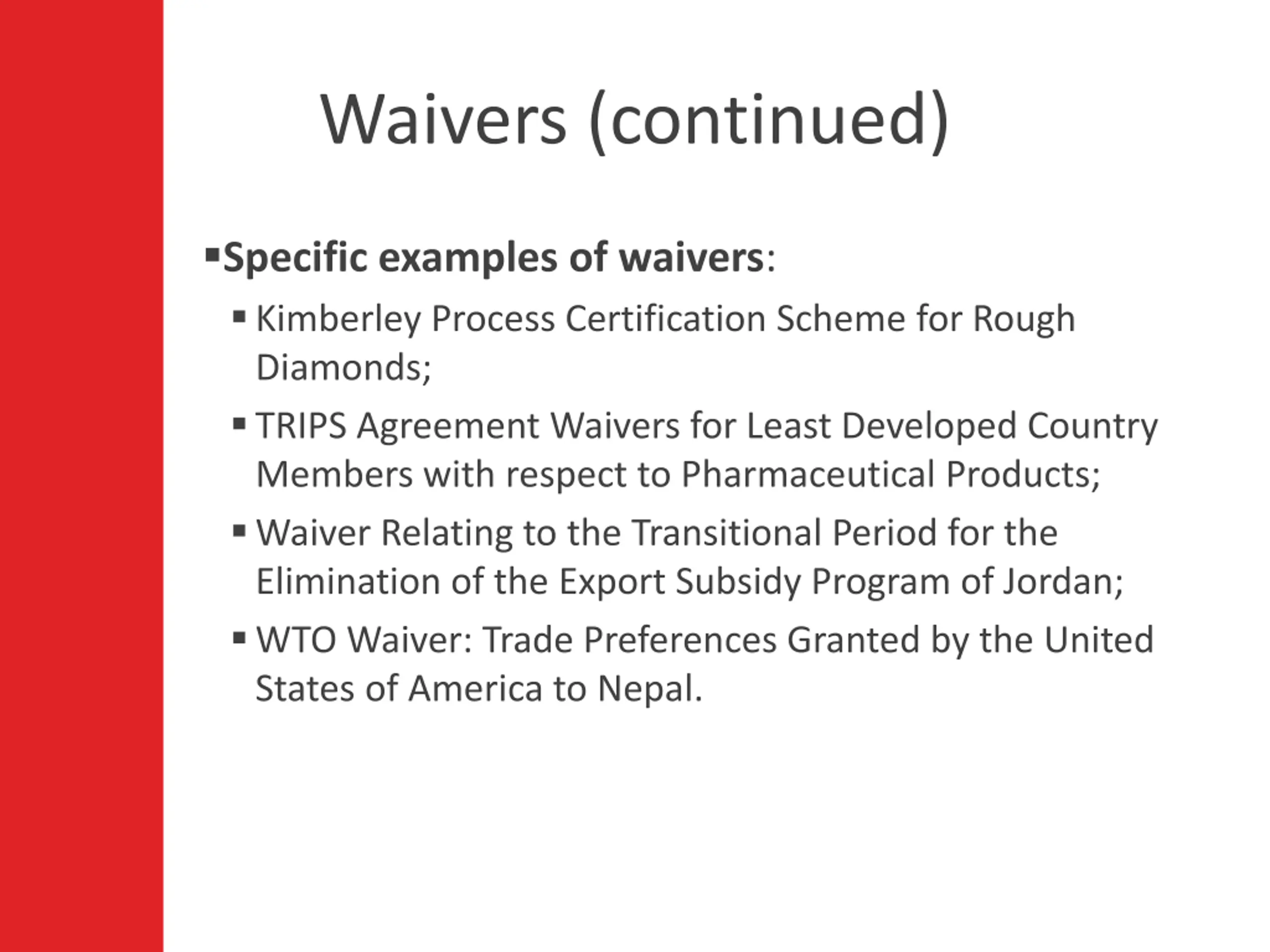 Waivers (continued) Specific examples of waivers: Kimberley Process Certification Scheme for Rough Diamonds; TRIPS Agreement Waivers for Least Developed Country Members with respect to Pharmaceutical Products; Waiver Relating to the Transitional Period for the Elimination of the Export Subsidy Program of Jordan; WTO Waiver: Trade Preferences Granted by the United States of America to Nepal.