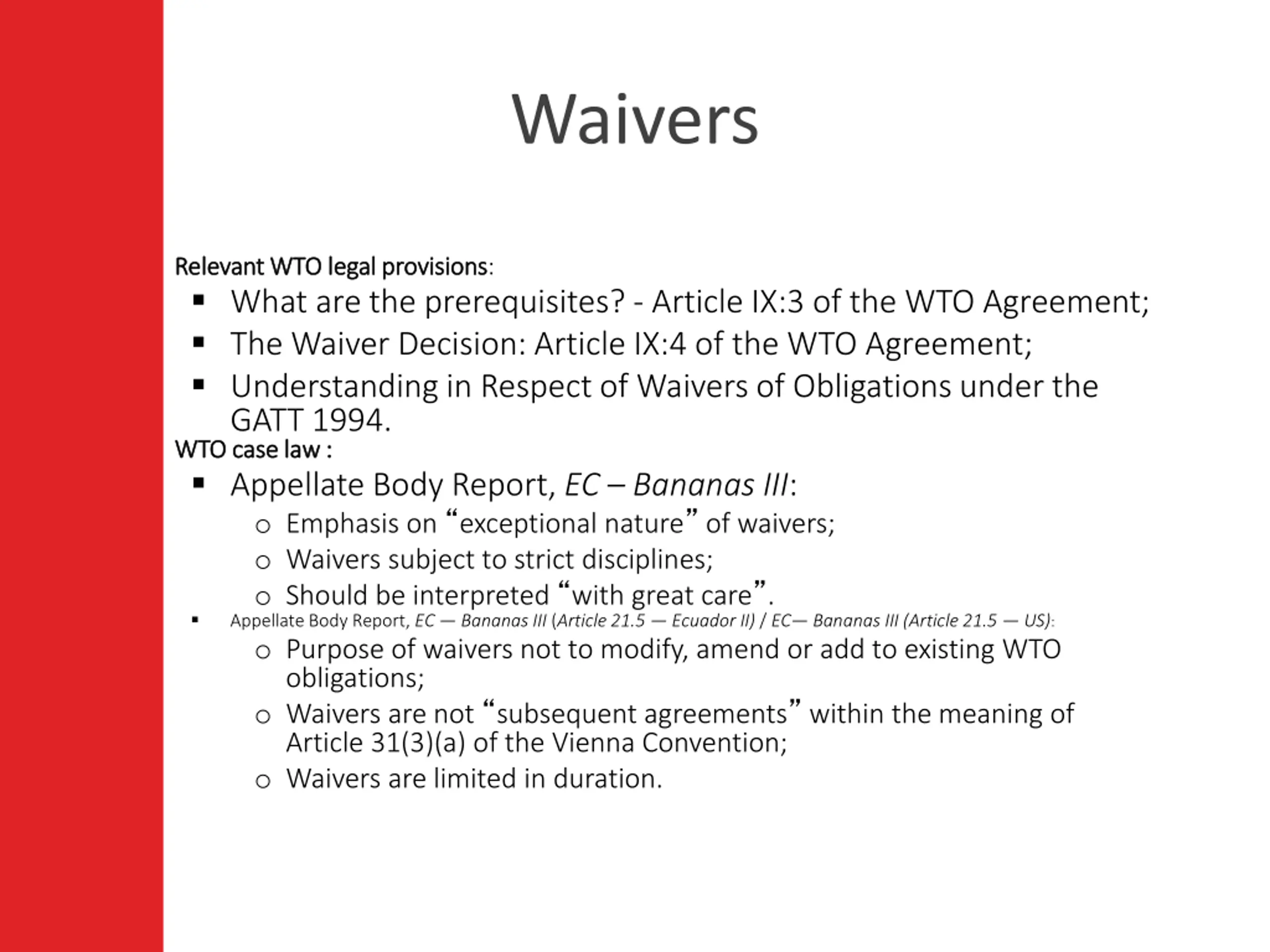 Waivers Relevant WTO legal provisions Relevant WTO legal provisions: What are the prerequisites? - Article IX:3 of the WTO Agreement; The Waiver Decision: Article IX:4 of the WTO Agreement; Understanding in Respect of Waivers of Obligations under the GATT 1994. WTO case law WTO case law : : Appellate Body Report, EC Bananas III: o Emphasis on exceptional nature of waivers; o Waivers subject to strict disciplines; o Should be interpreted with great care . Appellate Body Report, EC Bananas III (Article 21.5 Ecuador II) / EC Bananas III (Article 21.5 US): o Purpose of waivers not to modify, amend or add to existing WTO obligations; o Waivers are not subsequent agreements within the meaning of Article 31(3)(a) of the Vienna Convention; o Waivers are limited in duration.