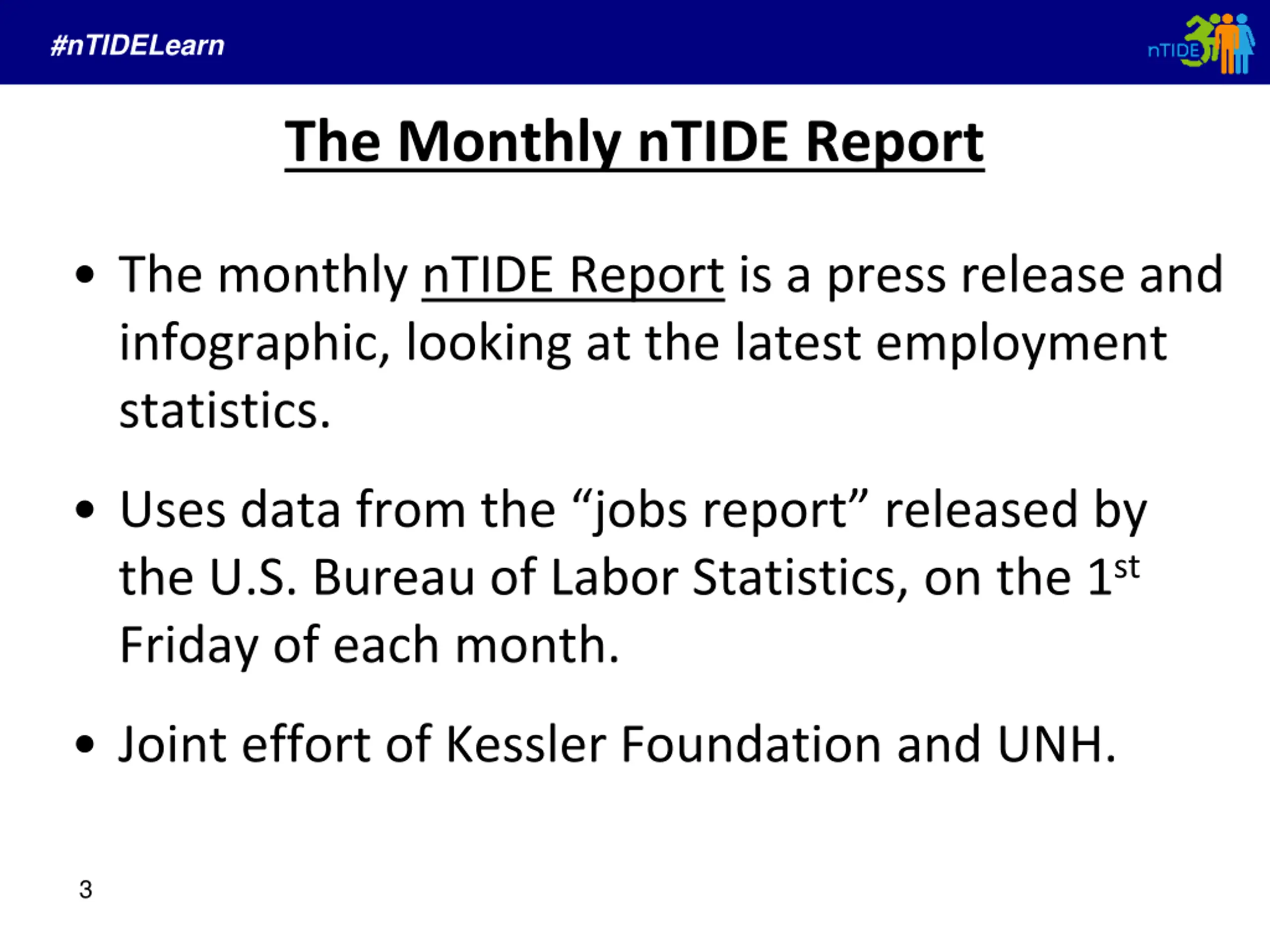 #nTIDELearn The Monthly nTIDE Report The monthly nTIDE Report is a press release and infographic, looking at the latest employment statistics. Uses data from the jobs report released by the U.S. Bureau of Labor Statistics, on the 1st Friday of each month. Joint effort of Kessler Foundation and UNH. 3