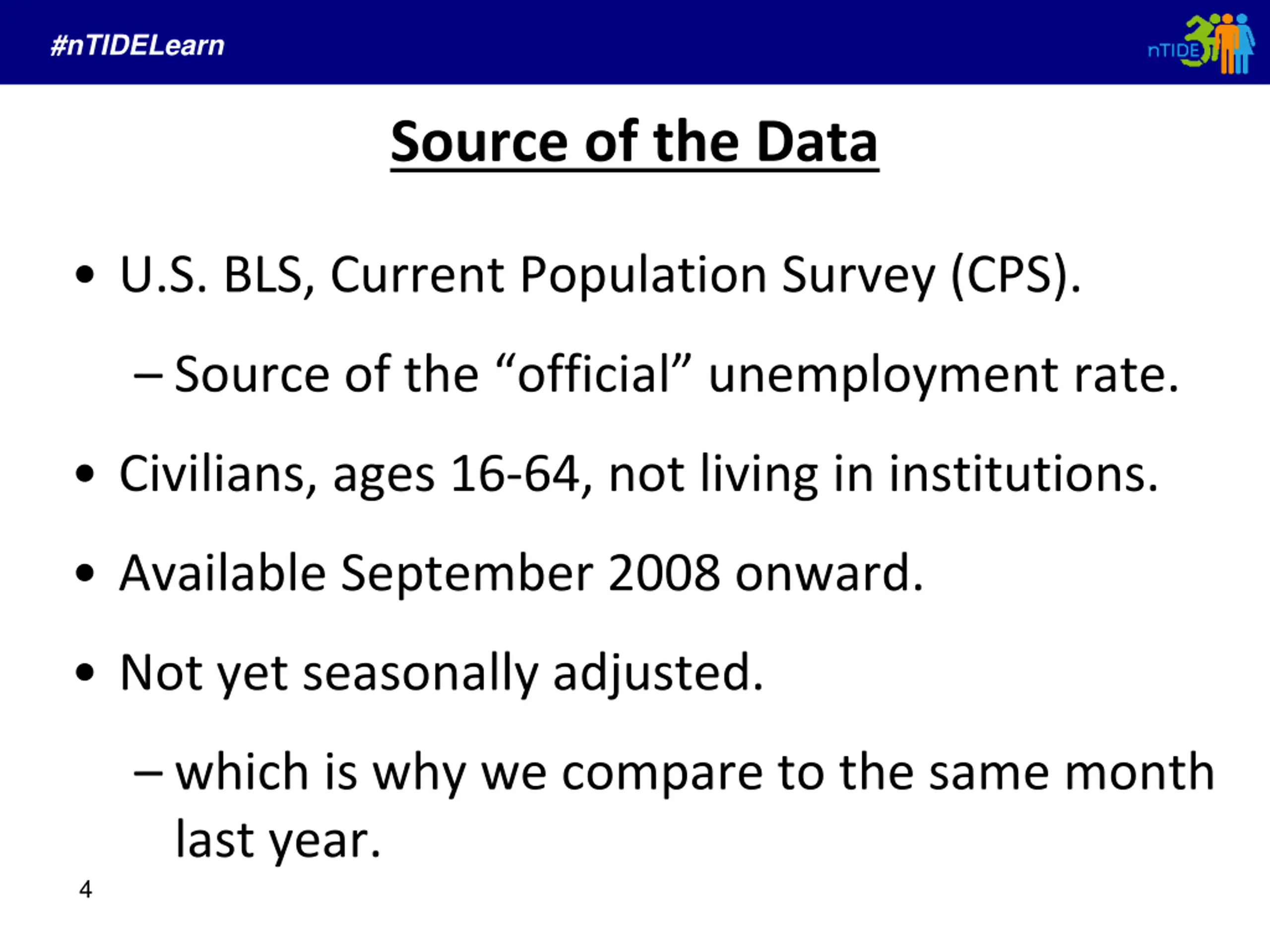 #nTIDELearn Source of the Data U.S. BLS, Current Population Survey (CPS). Source of the official unemployment rate. Civilians, ages 16-64, not living in institutions. Available September 2008 onward. Not yet seasonally adjusted. which is why we compare to the same month last year. 4
