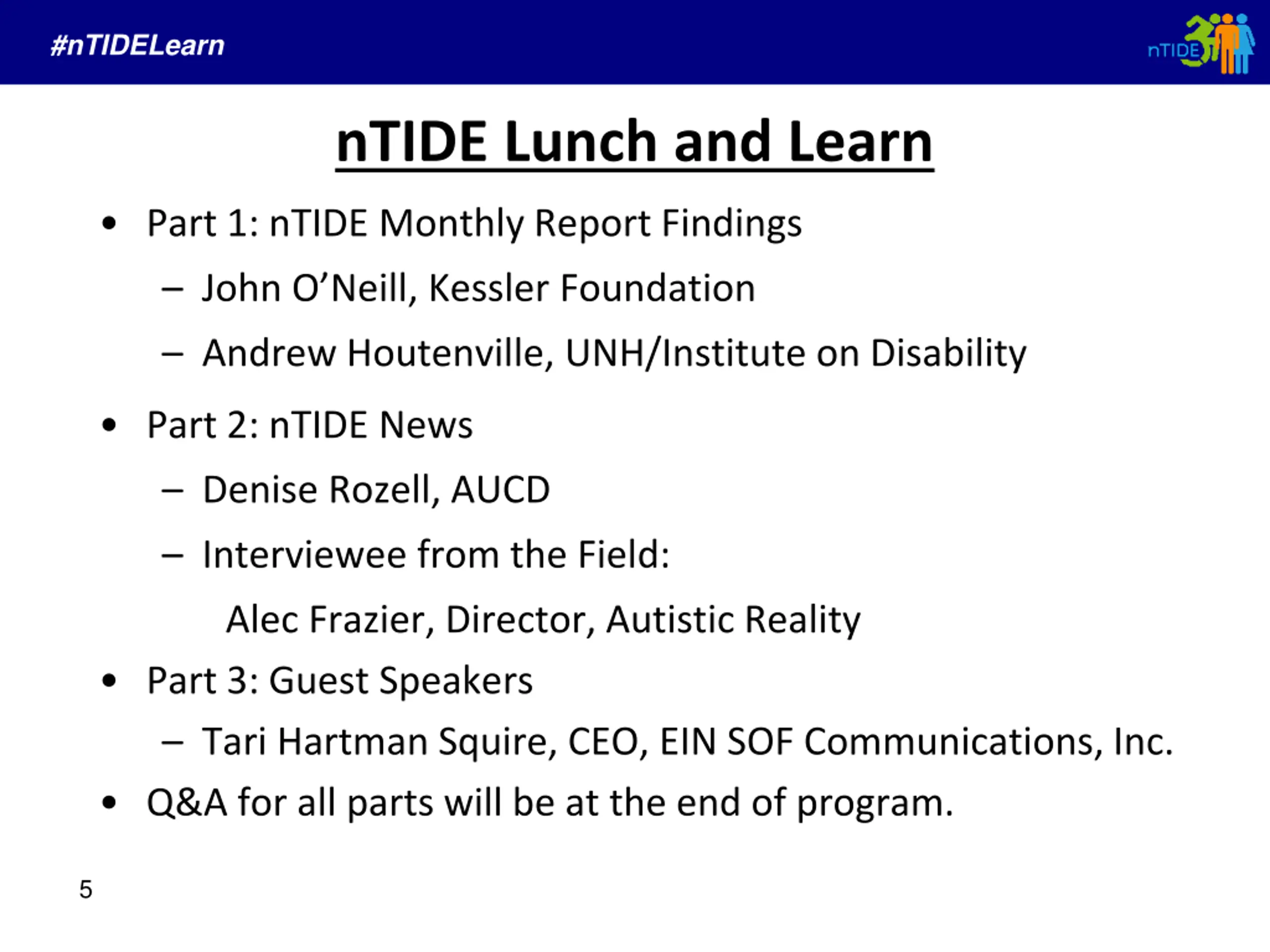 #nTIDELearn nTIDE Lunch and Learn Part 1: nTIDE Monthly Report Findings John O Neill, Kessler Foundation Andrew Houtenville, UNH/Institute on Disability Part 2: nTIDE News Denise Rozell, AUCD Interviewee from the Field: Alec Frazier, Director, Autistic Reality Part 3: Guest Speakers Tari Hartman Squire, CEO, EIN SOF Communications, Inc. Q&A for all parts will be at the end of program. 5