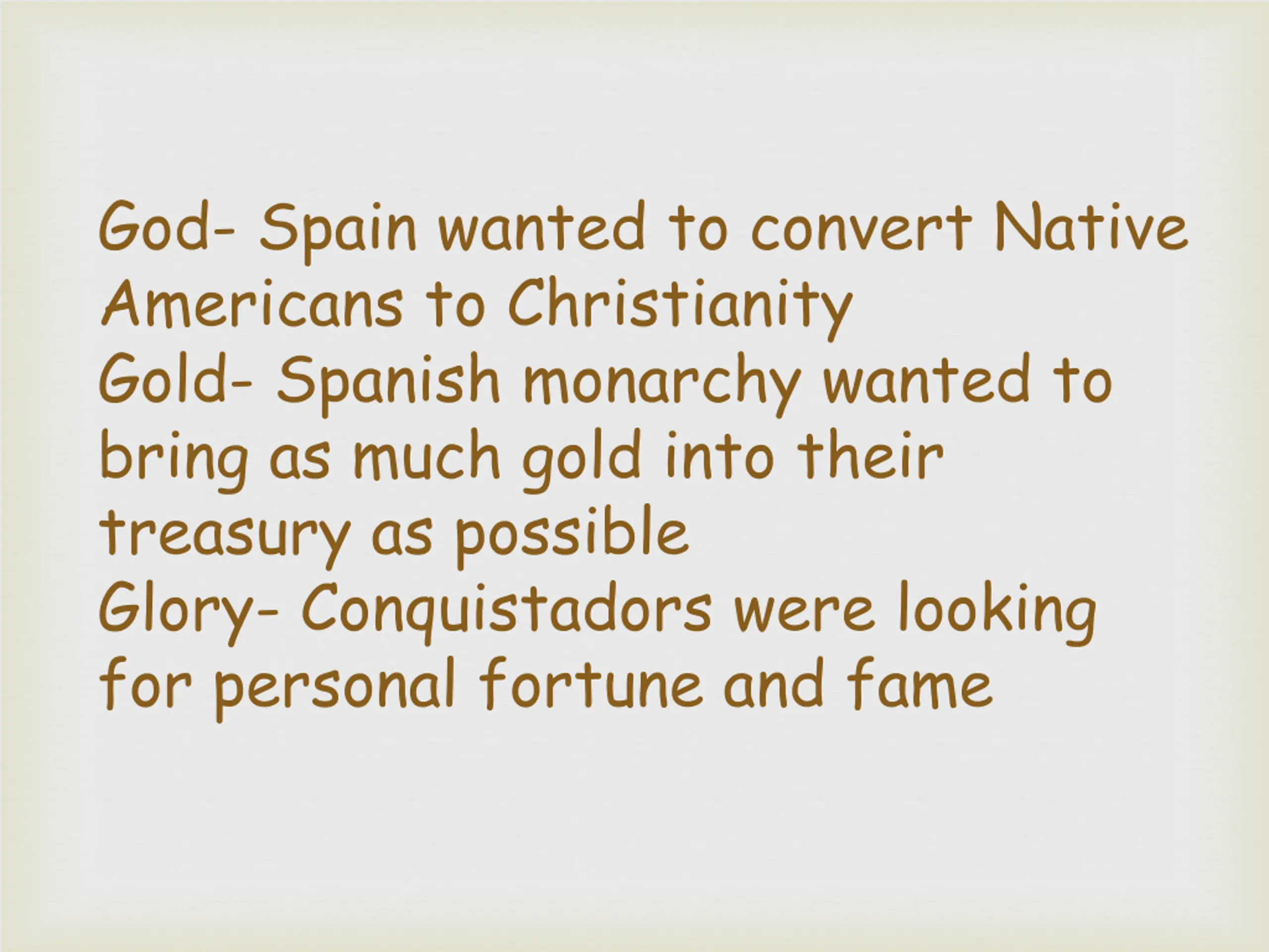 God- Spain wanted to convert Native Americans to Christianity Gold- Spanish monarchy wanted to bring as much gold into their treasury as possible Glory- Conquistadors were looking for personal fortune and fame