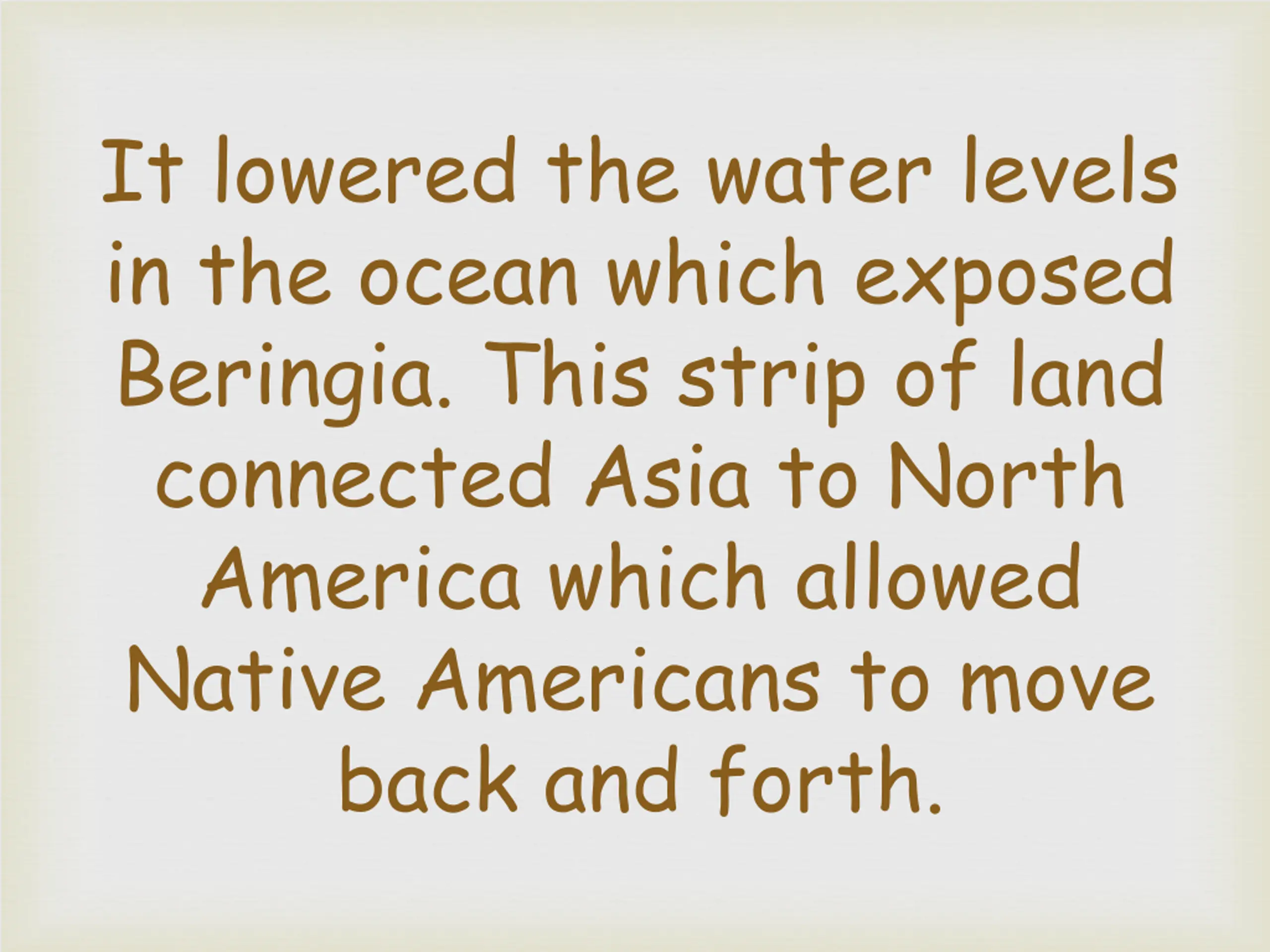 It lowered the water levels in the ocean which exposed Beringia. This strip of land connected Asia to North America which allowed Native Americans to move back and forth.