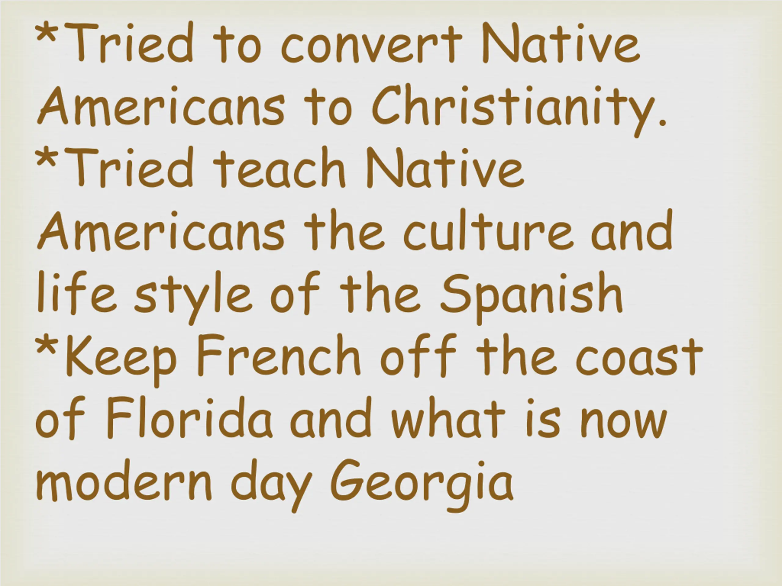 *Tried to convert Native Americans to Christianity. *Tried teach Native Americans the culture and life style of the Spanish *Keep French off the coast of Florida and what is now modern day Georgia