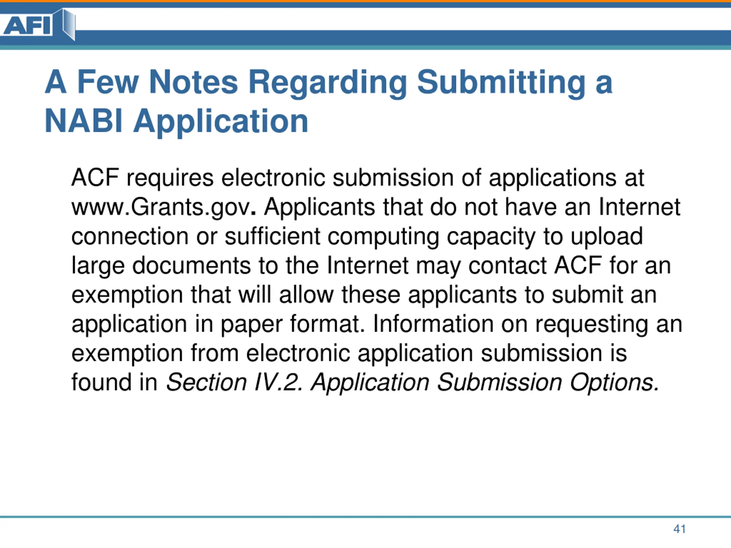 A Few Notes Regarding Submitting a NABI Application ACF requires electronic submission of applications at www.Grants.gov. Applicants that do not have an Internet connection or sufficient computing capacity to upload large documents to the Internet may contact ACF for an exemption that will allow these applicants to submit an application in paper format. Information on requesting an exemption from electronic application submission is found in Section IV.2. Application Submission Options. 41