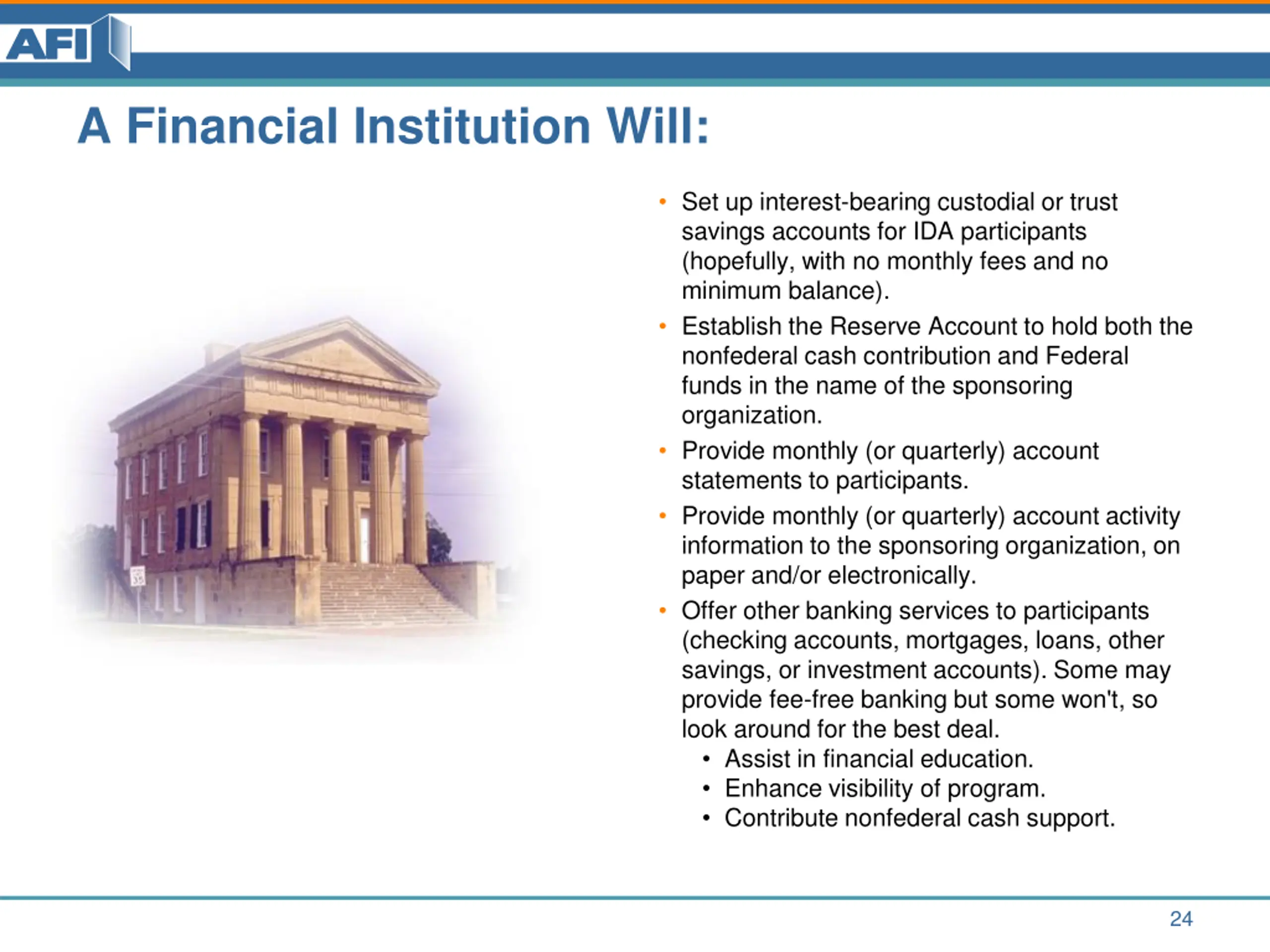 A Financial Institution Will: Set up interest-bearing custodial or trust savings accounts for IDA participants (hopefully, with no monthly fees and no minimum balance). Establish the Reserve Account to hold both the nonfederal cash contribution and Federal funds in the name of the sponsoring organization. Provide monthly (or quarterly) account statements to participants. Provide monthly (or quarterly) account activity information to the sponsoring organization, on paper and/or electronically. Offer other banking services to participants (checking accounts, mortgages, loans, other savings, or investment accounts). Some may provide fee-free banking but some won't, so look around for the best deal. Assist in financial education. Enhance visibility of program. Contribute nonfederal cash support. 24