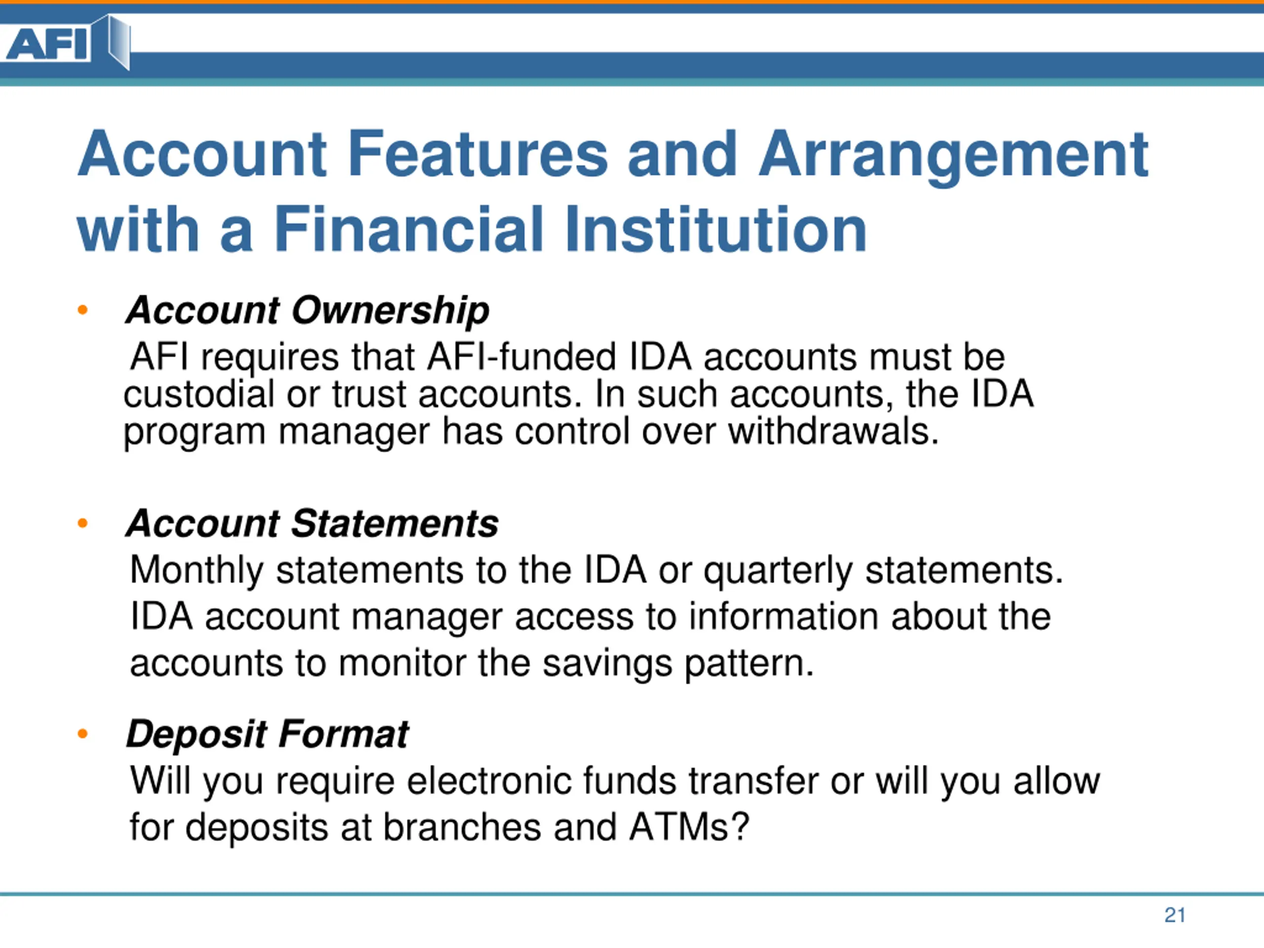 Account Features and Arrangement with a Financial Institution Account Ownership AFI requires that AFI-funded IDA accounts must be custodial or trust accounts. In such accounts, the IDA program manager has control over withdrawals. Account Statements Monthly statements to the IDA or quarterly statements. IDA account manager access to information about the accounts to monitor the savings pattern. Deposit Format Will you require electronic funds transfer or will you allow for deposits at branches and ATMs? 21