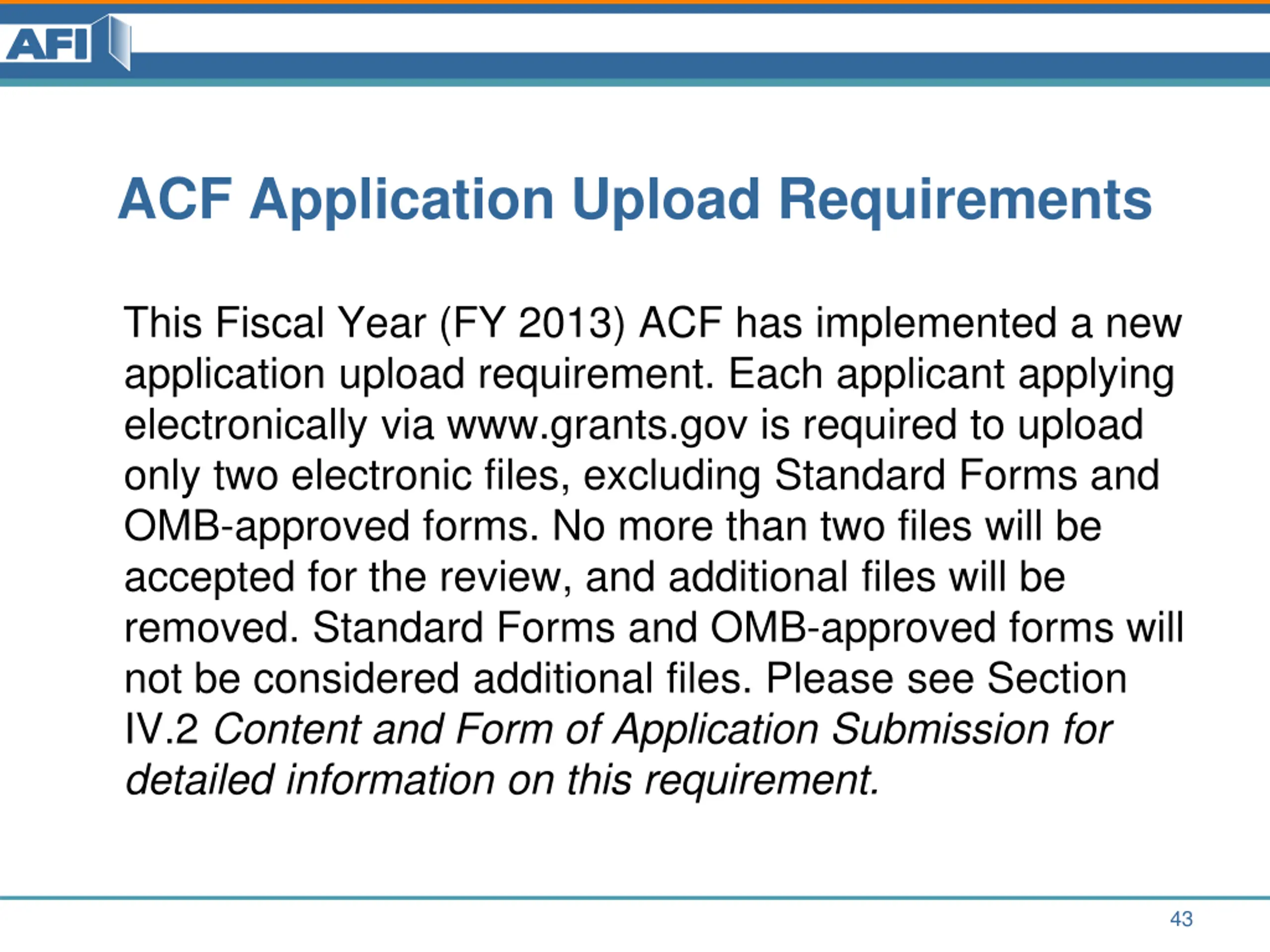 ACF Application Upload Requirements This Fiscal Year (FY 2013) ACF has implemented a new application upload requirement. Each applicant applying electronically via www.grants.gov is required to upload only two electronic files, excluding Standard Forms and OMB-approved forms. No more than two files will be accepted for the review, and additional files will be removed. Standard Forms and OMB-approved forms will not be considered additional files. Please see Section IV.2 Content and Form of Application Submission for detailed information on this requirement. 43