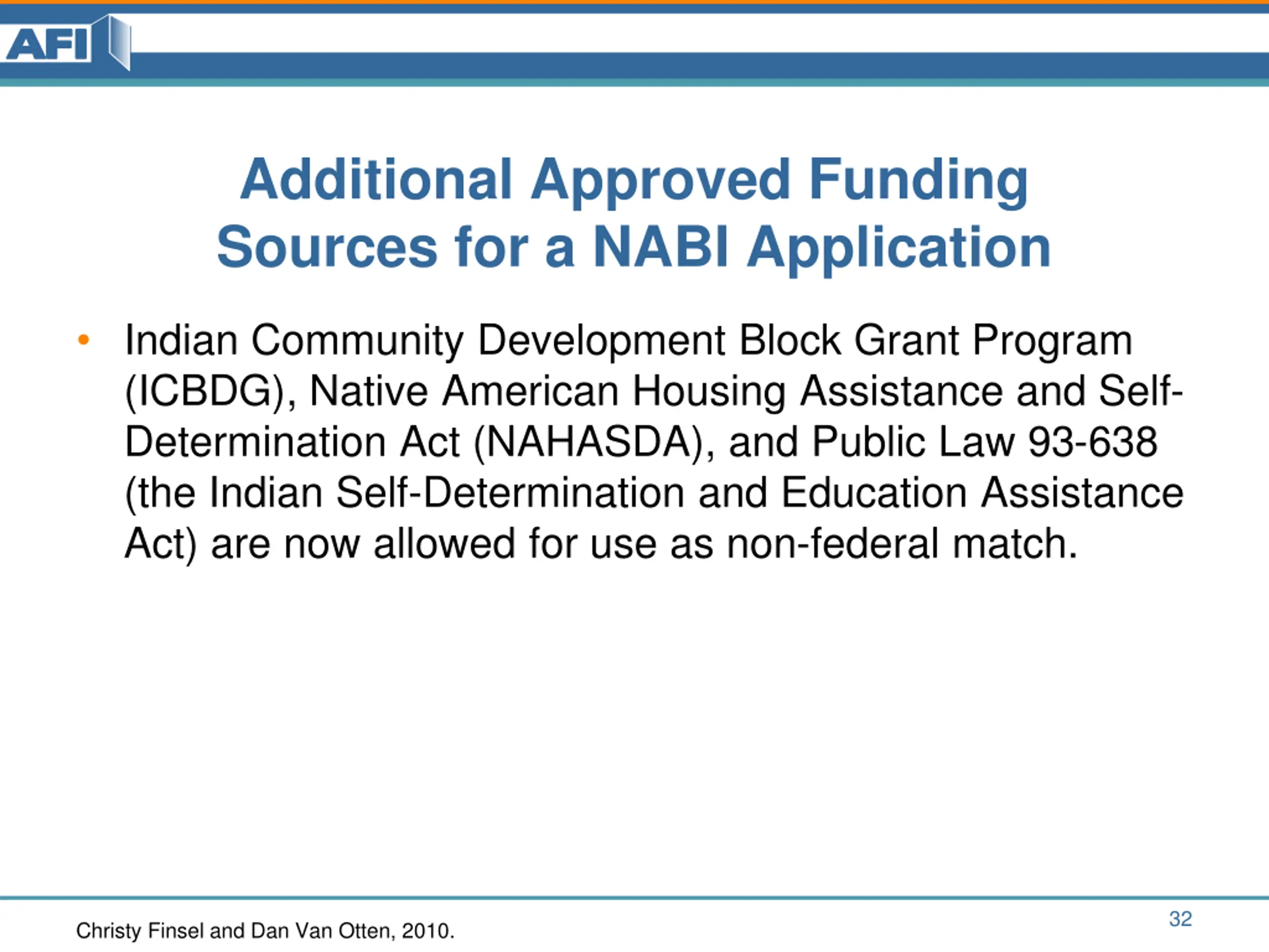 Additional Approved Funding Sources for a NABI Application Indian Community Development Block Grant Program (ICBDG), Native American Housing Assistance and Self- Determination Act (NAHASDA), and Public Law 93-638 (the Indian Self-Determination and Education Assistance Act) are now allowed for use as non-federal match. 32 Christy Finsel and Dan Van Otten, 2010.