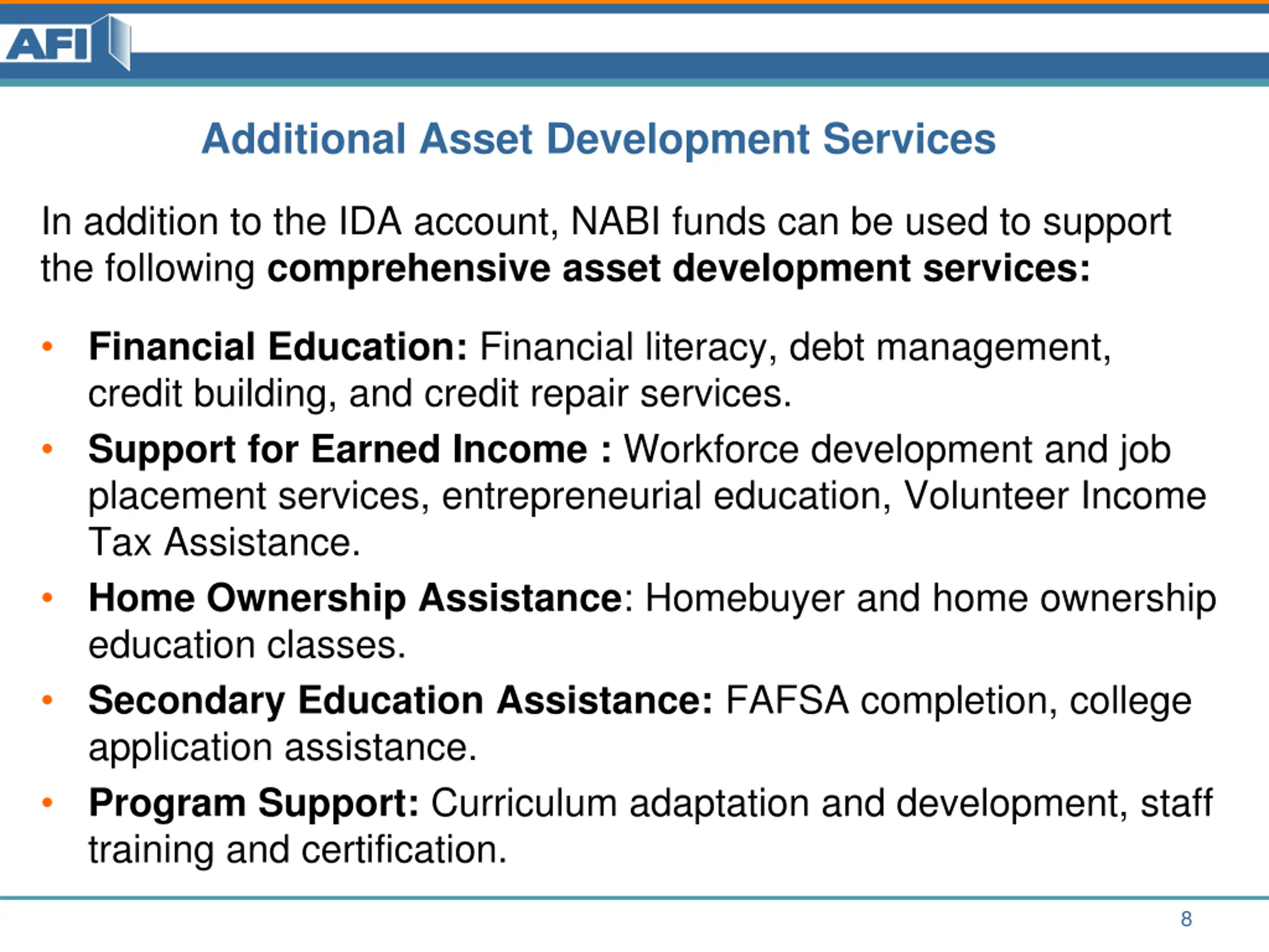 NABI and IDAs: An Essential Piece for Any Project Submitted under the NABI Funding Opportunity Announcement Must be the IDA Program How does an AFI IDA work? Save earned income: AFI IDA participants contribute earned income to a special matched savings account, known as the Individual Development Account (IDA). Receive match funds: For every dollar a participant saves in his/her IDA account, he/she is matched any where from $1 to $8. The match funds come from AFI funding and non-Federal funding. Participants can receive match funds up to $2,000 per individual, or $4,000 per household from the AFI grant award and at least an equal amount from non-Federal funds. Purchase an Asset: After saving earned income in the IDA for at least 6 months, participants can use their IDA savings and match funds to purchase a first-time home, start or expand a business, or pursue postsecondary education. 7