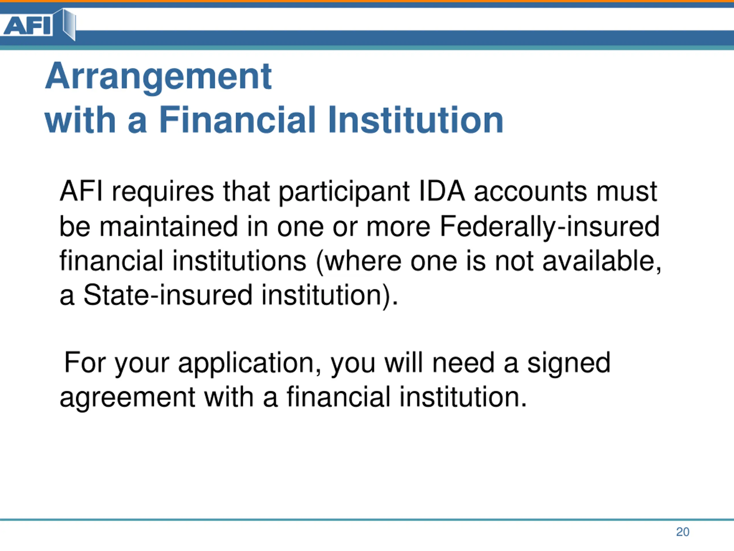 Arrangement with a Financial Institution AFI requires that participant IDA accounts must be maintained in one or more Federally-insured financial institutions (where one is not available, a State-insured institution). For your application, you will need a signed agreement with a financial institution. 20