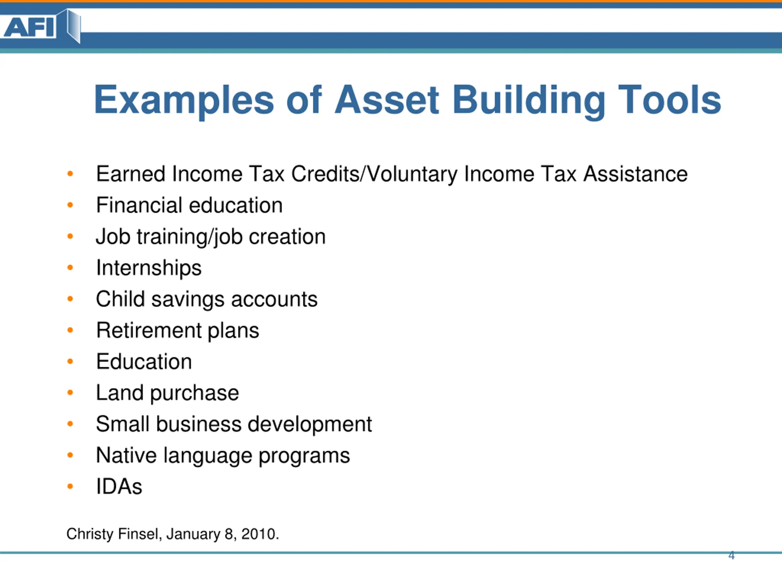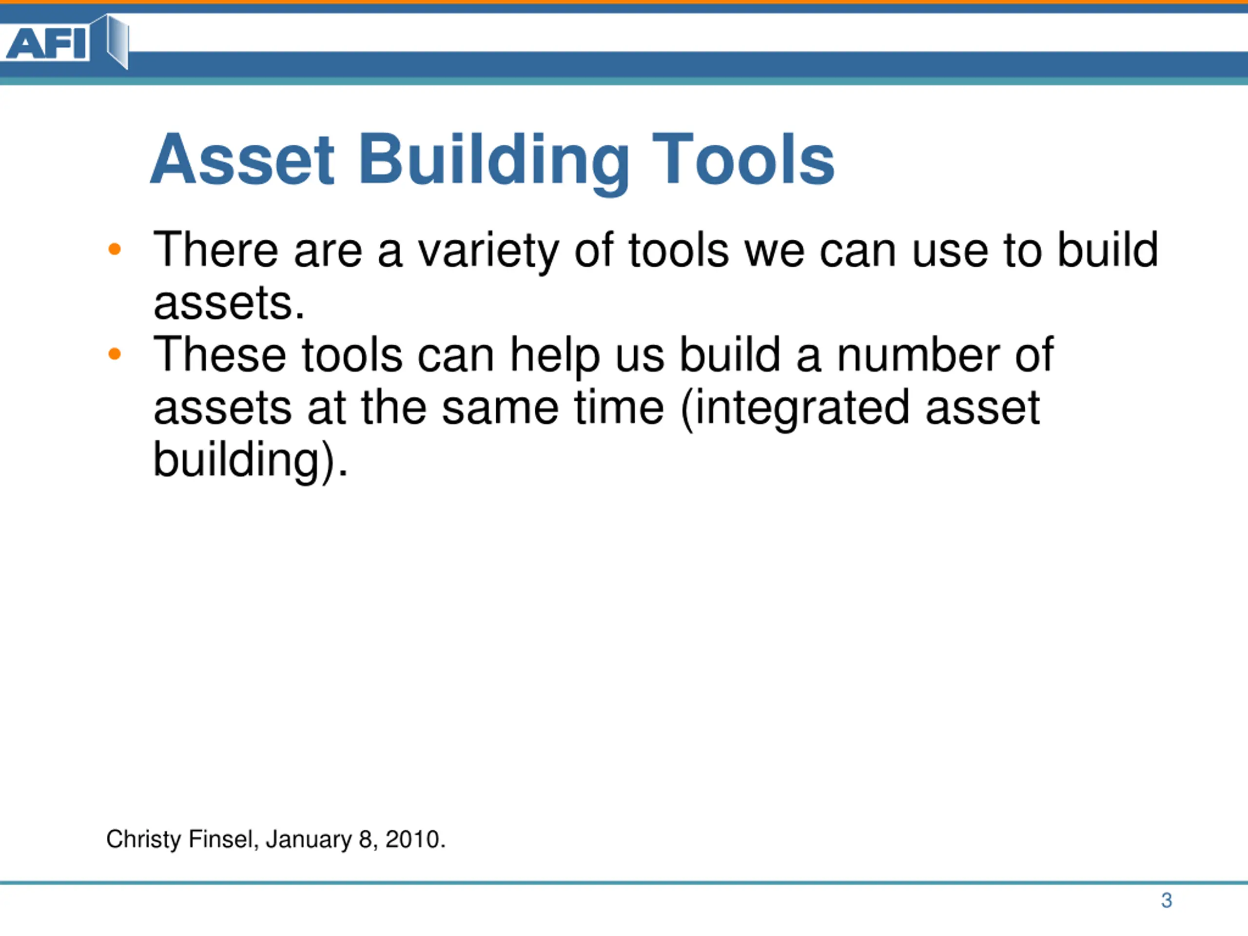 Asset Building Tools There are a variety of tools we can use to build assets. These tools can help us build a number of assets at the same time (integrated asset building). Christy Finsel, January 8, 2010. 3