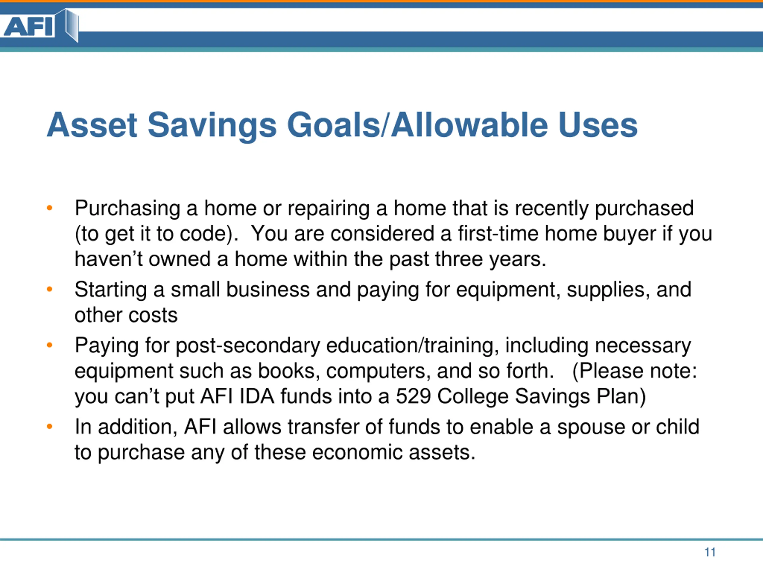 Asset Savings Goals/Allowable Uses Purchasing a home or repairing a home that is recently purchased (to get it to code). You are considered a first-time home buyer if you haven t owned a home within the past three years. Starting a small business and paying for equipment, supplies, and other costs Paying for post-secondary education/training, including necessary equipment such as books, computers, and so forth. (Please note: you can t put AFI IDA funds into a 529 College Savings Plan) In addition, AFI allows transfer of funds to enable a spouse or child to purchase any of these economic assets. 11