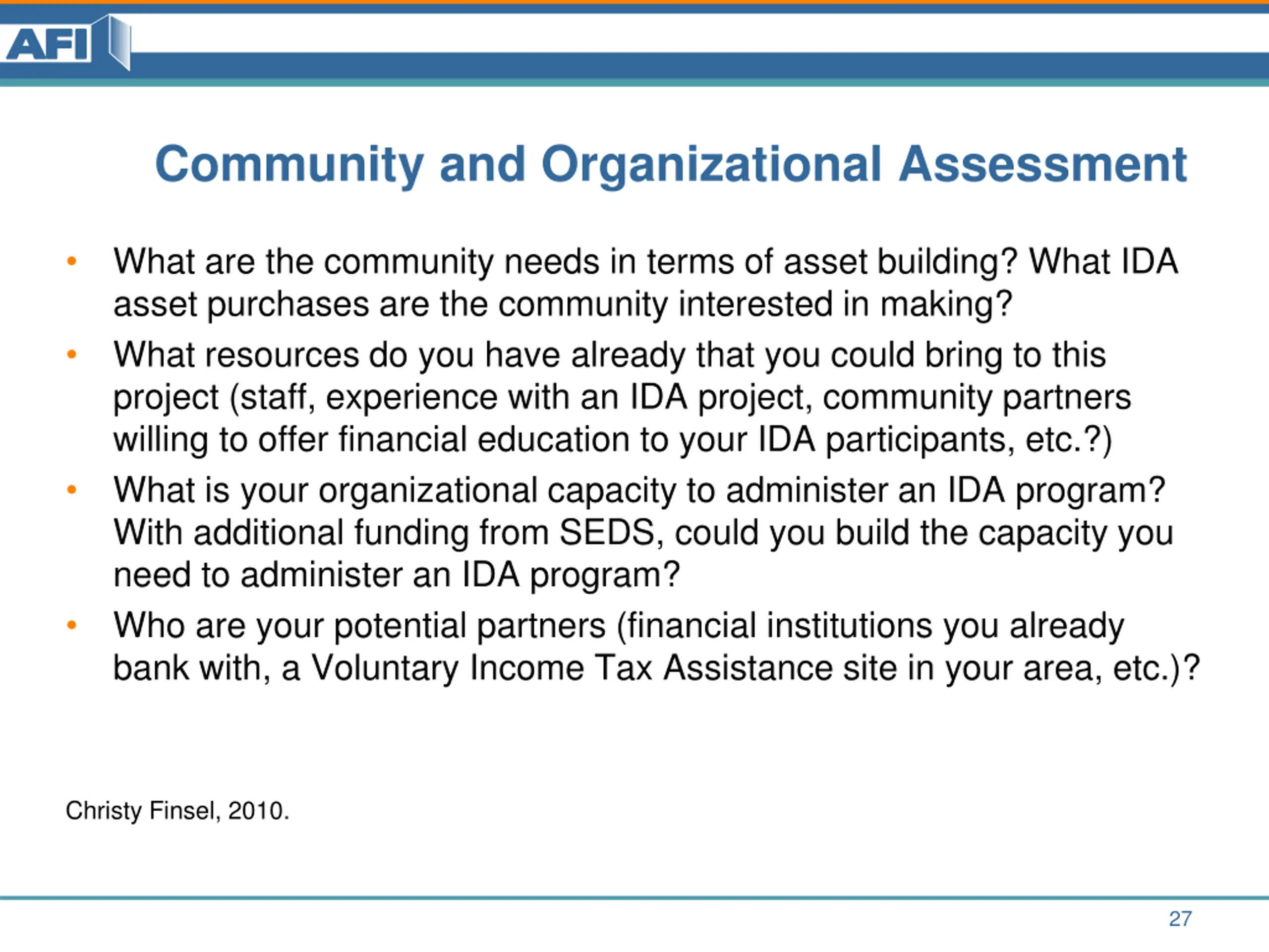 Community and Organizational Assessment What are the community needs in terms of asset building? What IDA asset purchases are the community interested in making? What resources do you have already that you could bring to this project (staff, experience with an IDA project, community partners willing to offer financial education to your IDA participants, etc.?) What is your organizational capacity to administer an IDA program? With additional funding from SEDS, could you build the capacity you need to administer an IDA program? Who are your potential partners (financial institutions you already bank with, a Voluntary Income Tax Assistance site in your area, etc.)? Christy Finsel, 2010. 27