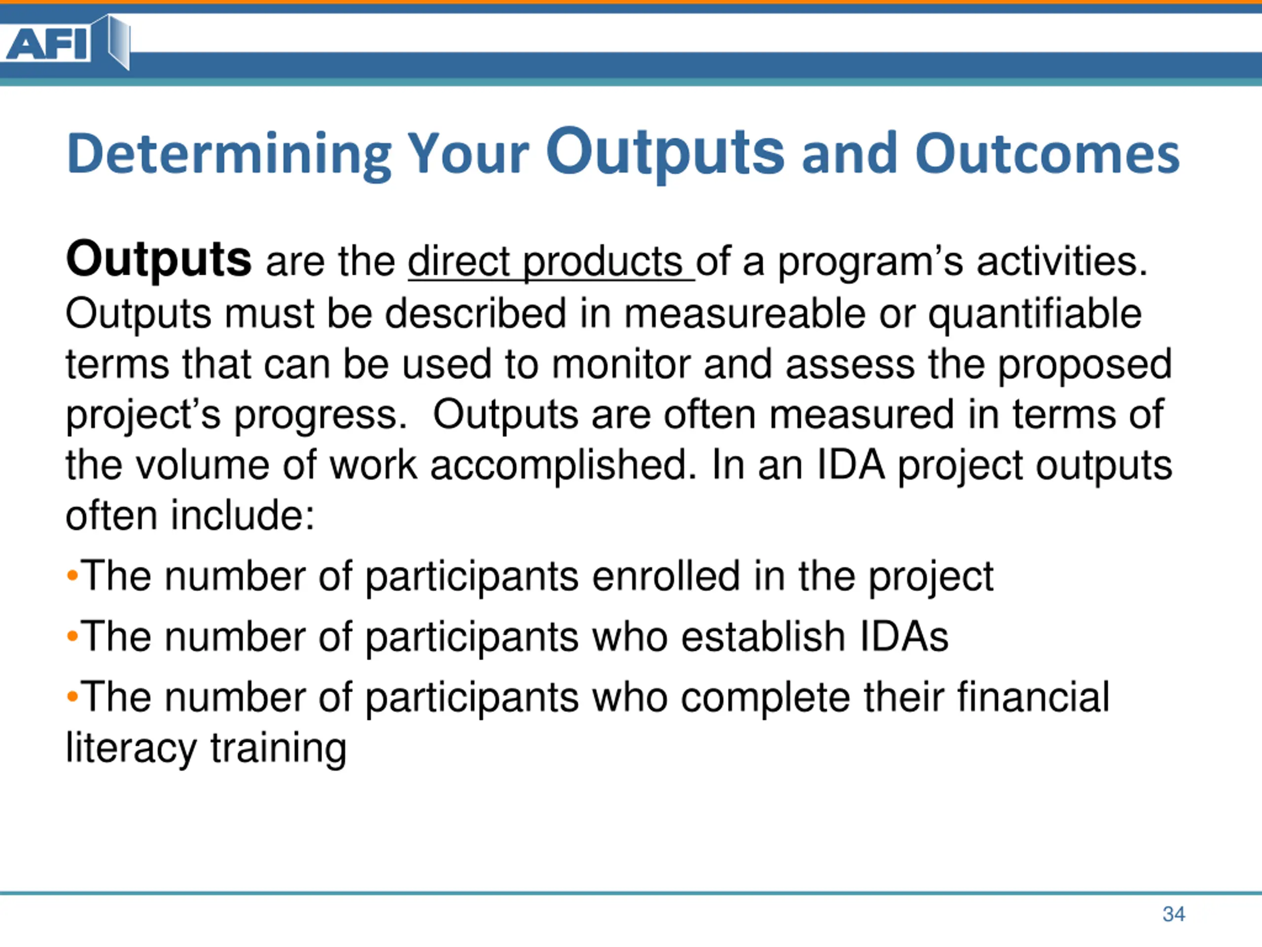 Determining Your Outputs and Outcomes Outputs are the direct products of a program s activities. Outputs must be described in measureable or quantifiable terms that can be used to monitor and assess the proposed project s progress. Outputs are often measured in terms of the volume of work accomplished. In an IDA project outputs often include: The number of participants enrolled in the project The number of participants who establish IDAs The number of participants who complete their financial literacy training 34