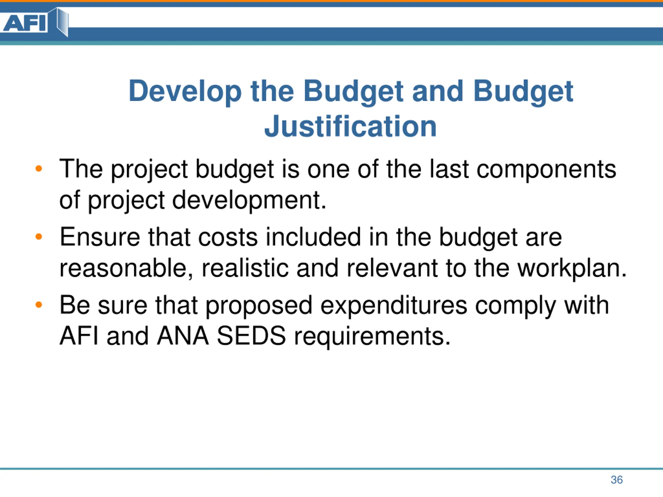 Develop the Budget and Budget Justification The project budget is one of the last components of project development. Ensure that costs included in the budget are reasonable, realistic and relevant to the workplan. Be sure that proposed expenditures comply with AFI and ANA SEDS requirements. 36