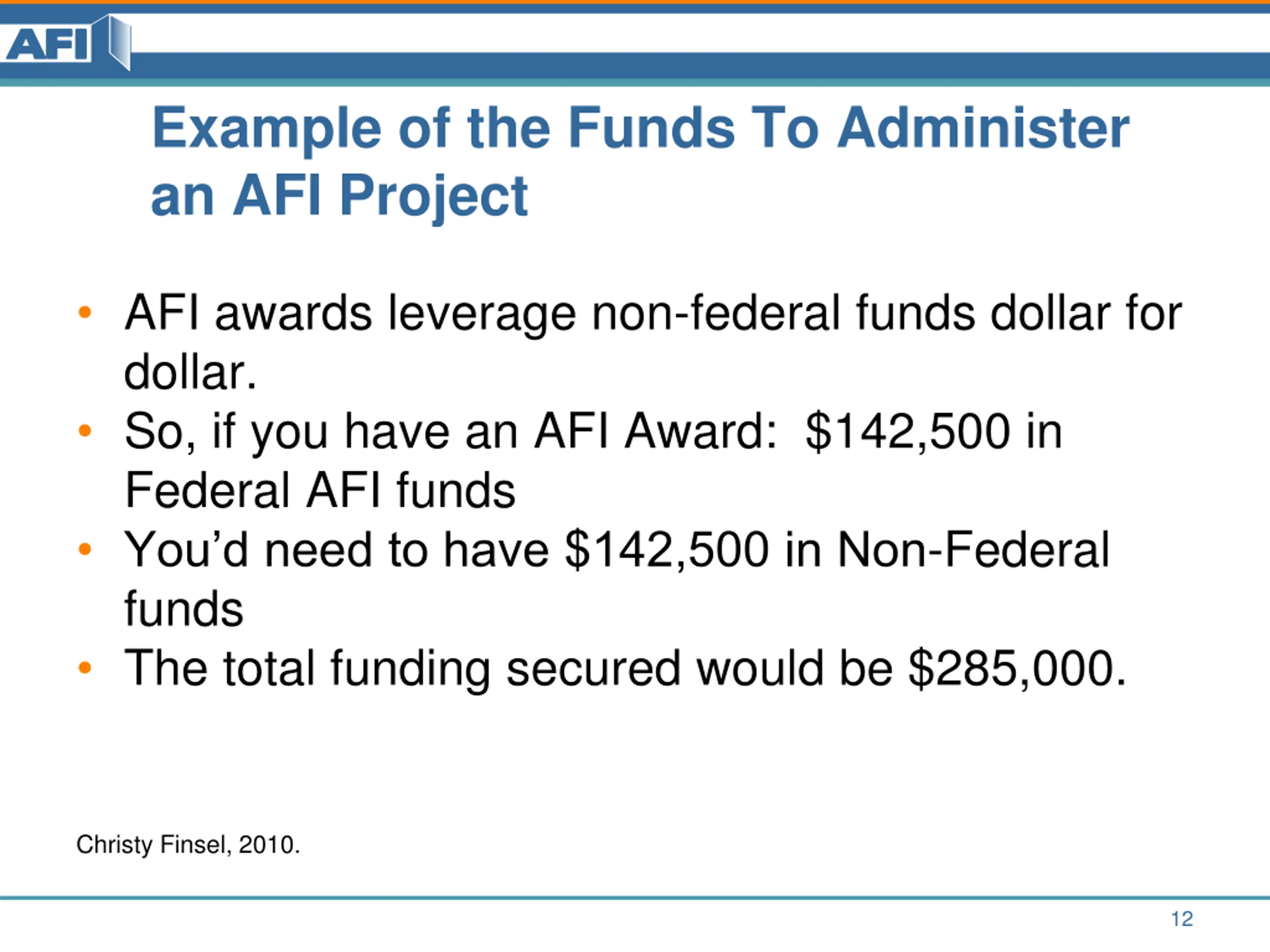 Example of the Funds To Administer an AFI Project AFI awards leverage non-federal funds dollar for dollar. So, if you have an AFI Award: $142,500 in Federal AFI funds You d need to have $142,500 in Non-Federal funds The total funding secured would be $285,000. Christy Finsel, 2010. 12