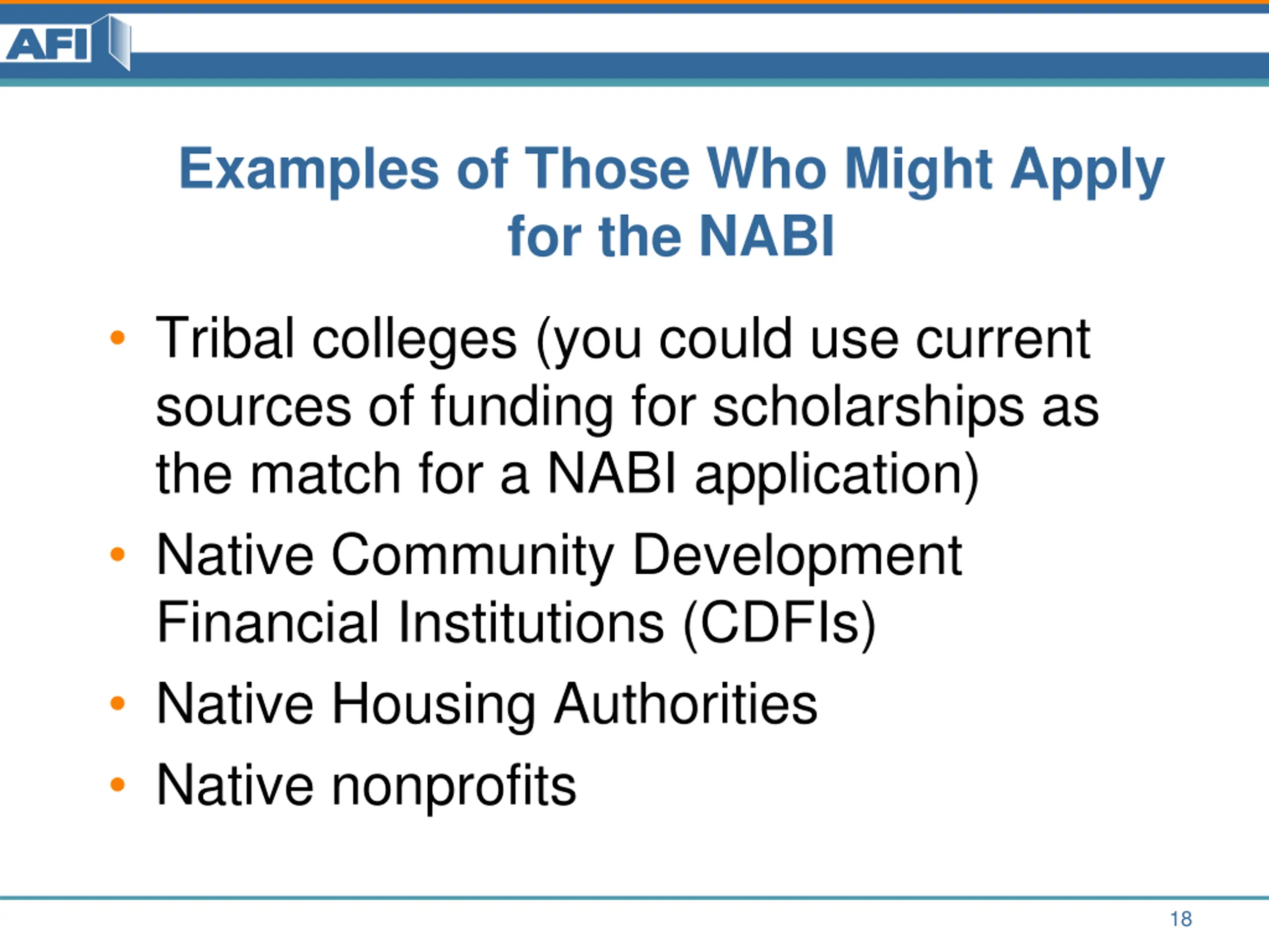 Examples of Those Who Might Apply for the NABI Tribal colleges (you could use current sources of funding for scholarships as the match for a NABI application) Native Community Development Financial Institutions (CDFIs) Native Housing Authorities Native nonprofits 18