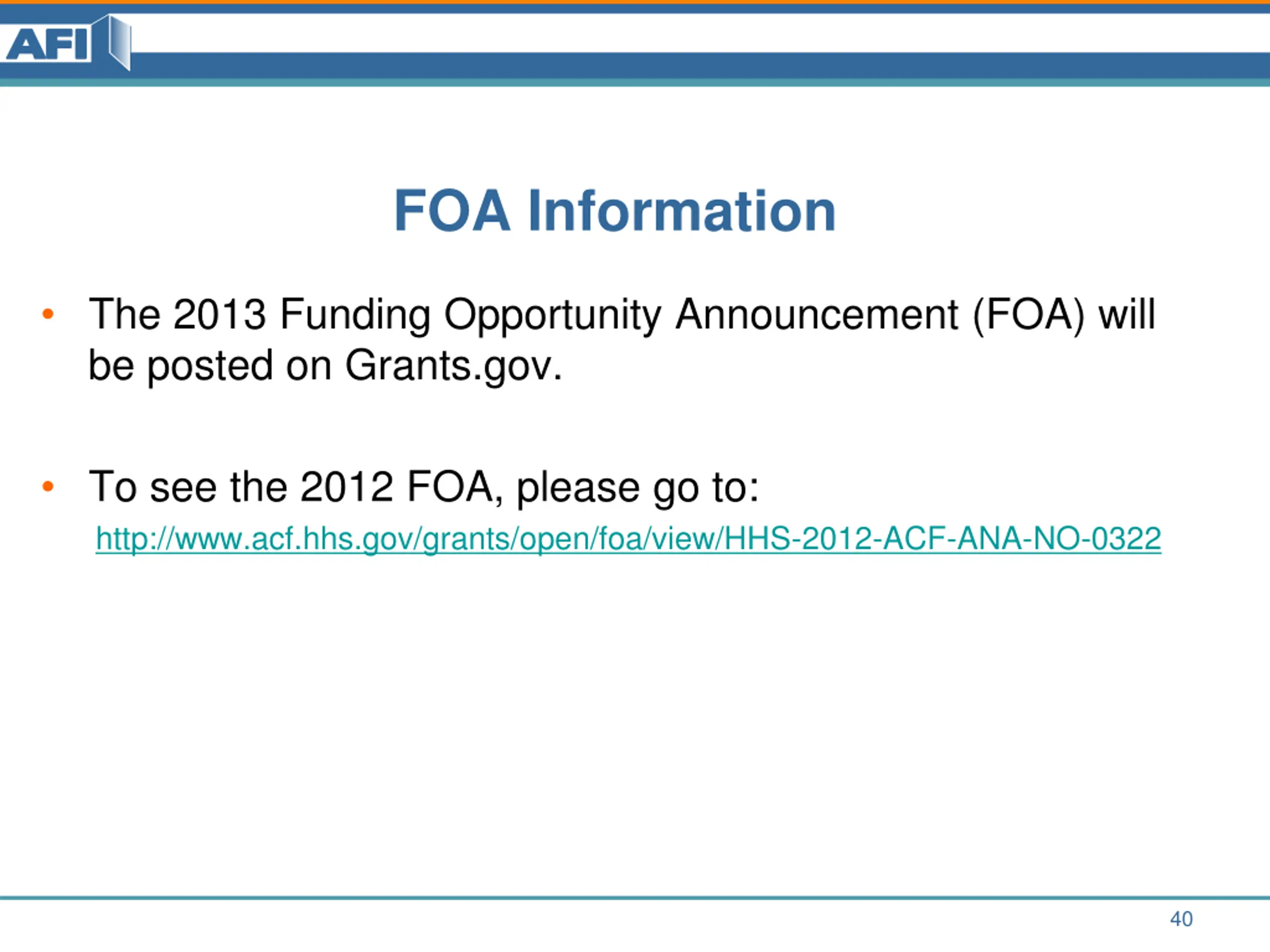 FOA Information The 2013 Funding Opportunity Announcement (FOA) will be posted on Grants.gov. To see the 2012 FOA, please go to: http://www.acf.hhs.gov/grants/open/foa/view/HHS-2012-ACF-ANA-NO-0322 40