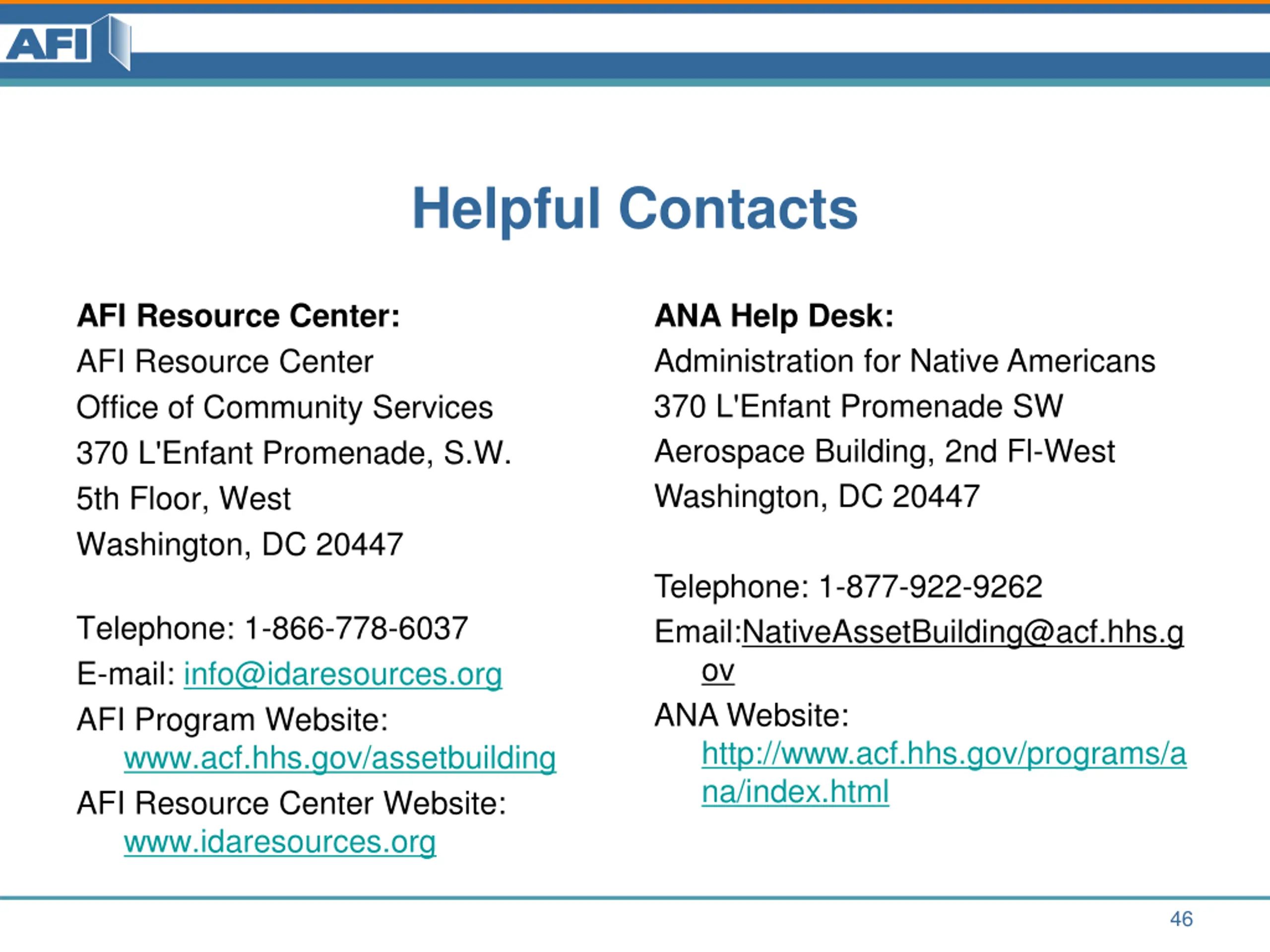 Helpful Contacts AFI Resource Center: AFI Resource Center Office of Community Services 370 L'Enfant Promenade, S.W. 5th Floor, West Washington, DC 20447 ANA Help Desk: Administration for Native Americans 370 L'Enfant Promenade SW Aerospace Building, 2nd Fl-West Washington, DC 20447 Telephone: 1-877-922-9262 Email:NativeAssetBuilding@acf.hhs.g ov ANA Website: http://www.acf.hhs.gov/programs/a na/index.html Telephone: 1-866-778-6037 E-mail: info@idaresources.org AFI Program Website: www.acf.hhs.gov/assetbuilding AFI Resource Center Website: www.idaresources.org 46