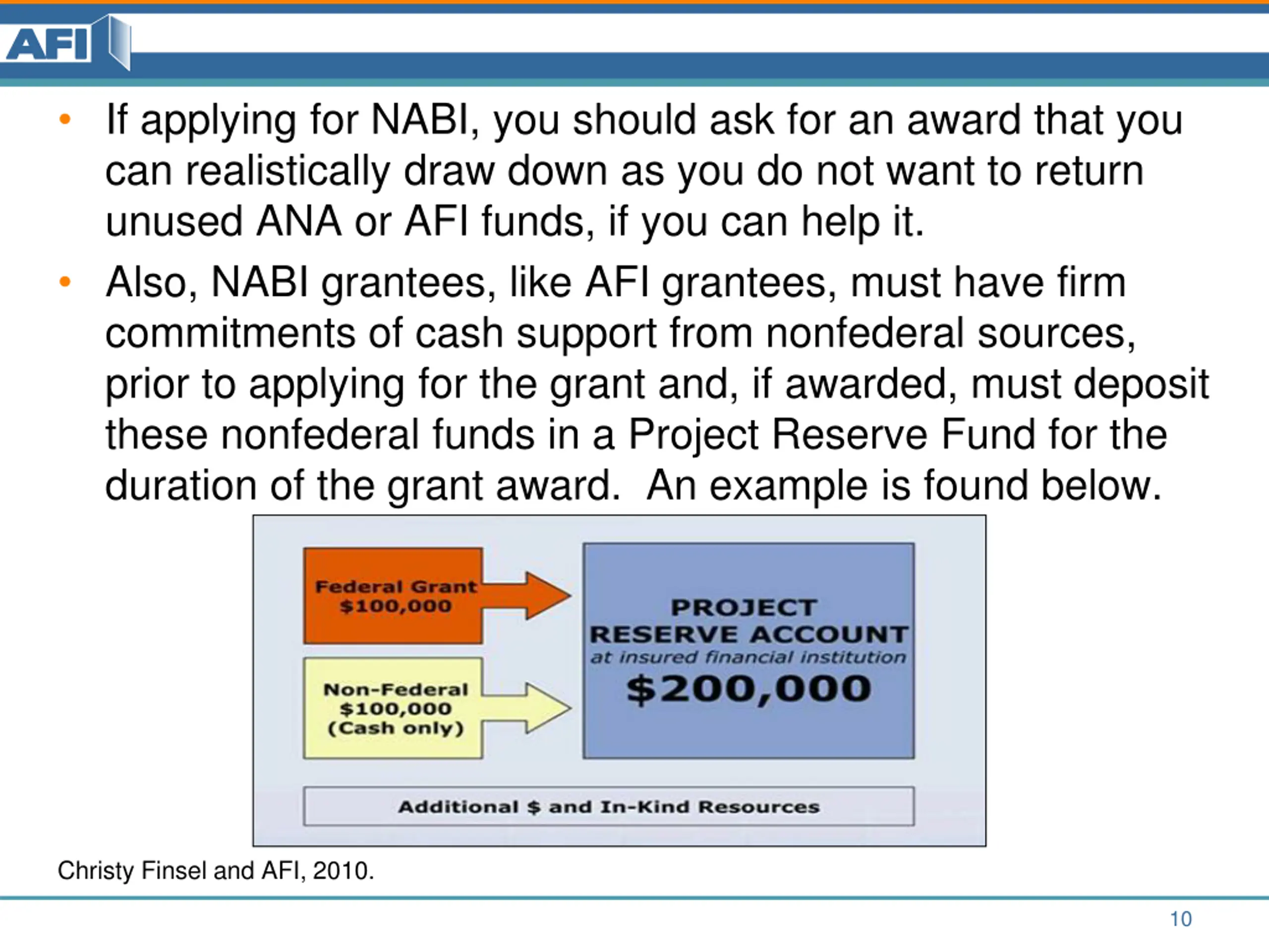 If applying for NABI, you should ask for an award that you can realistically draw down as you do not want to return unused ANA or AFI funds, if you can help it. Also, NABI grantees, like AFI grantees, must have firm commitments of cash support from nonfederal sources, prior to applying for the grant and, if awarded, must deposit these nonfederal funds in a Project Reserve Fund for the duration of the grant award. An example is found below. Christy Finsel and AFI, 2010. 10