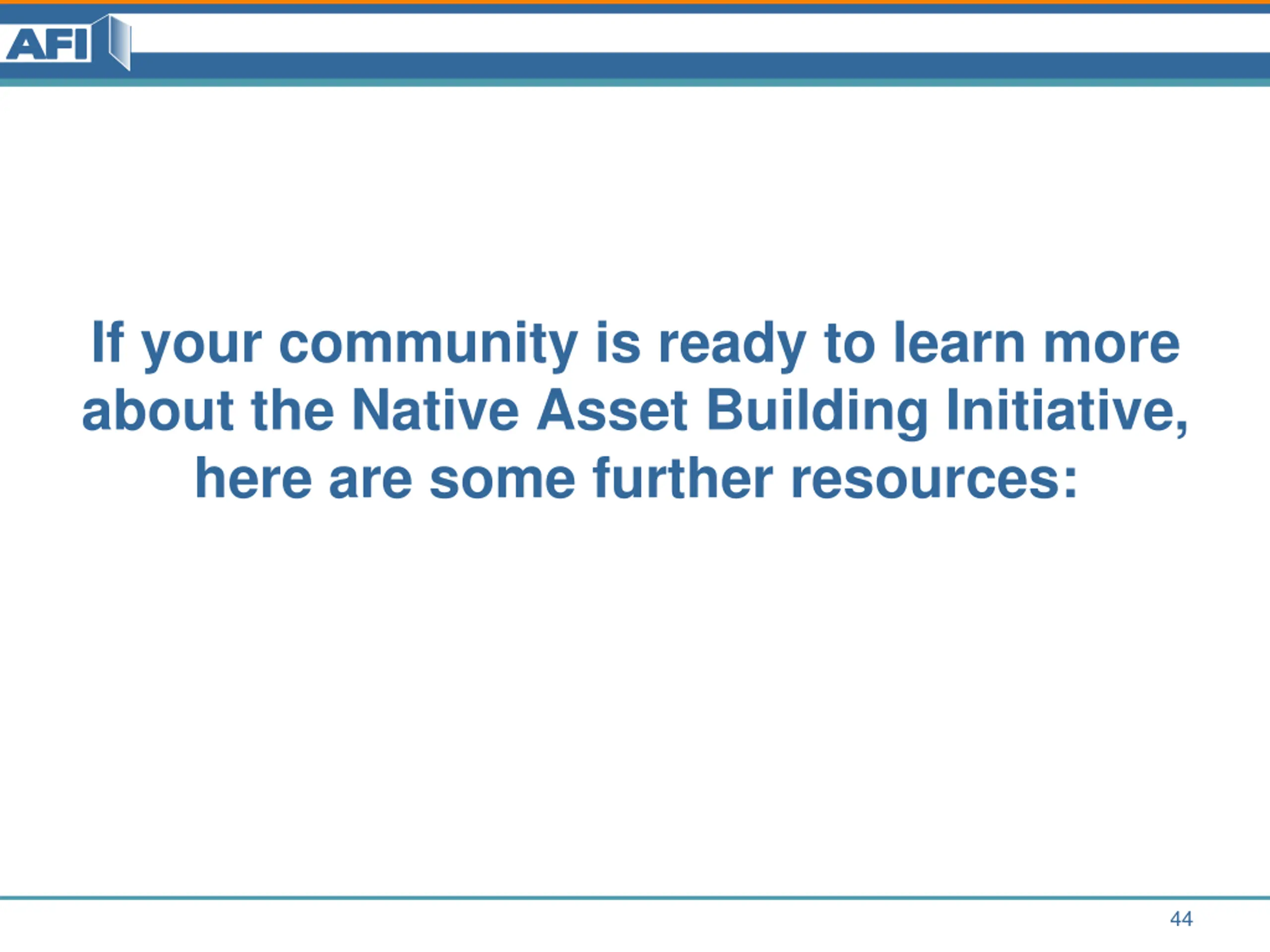 If your community is ready to learn more about the Native Asset Building Initiative, here are some further resources: 44