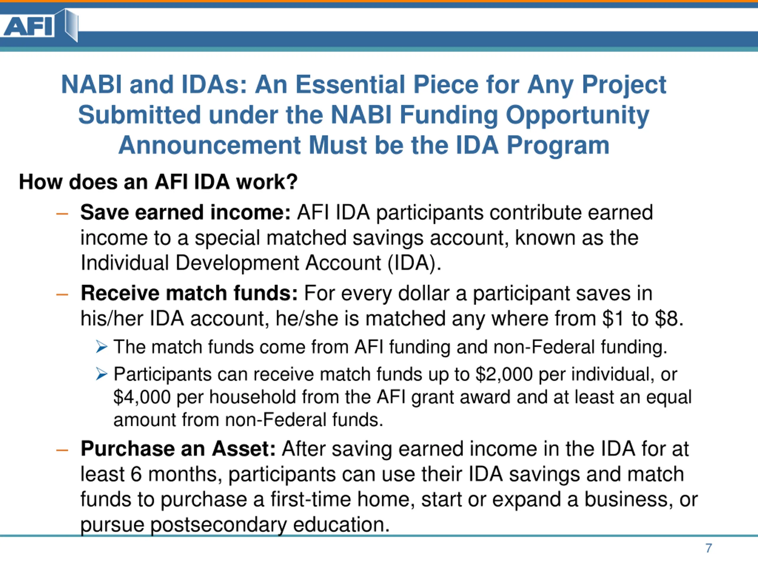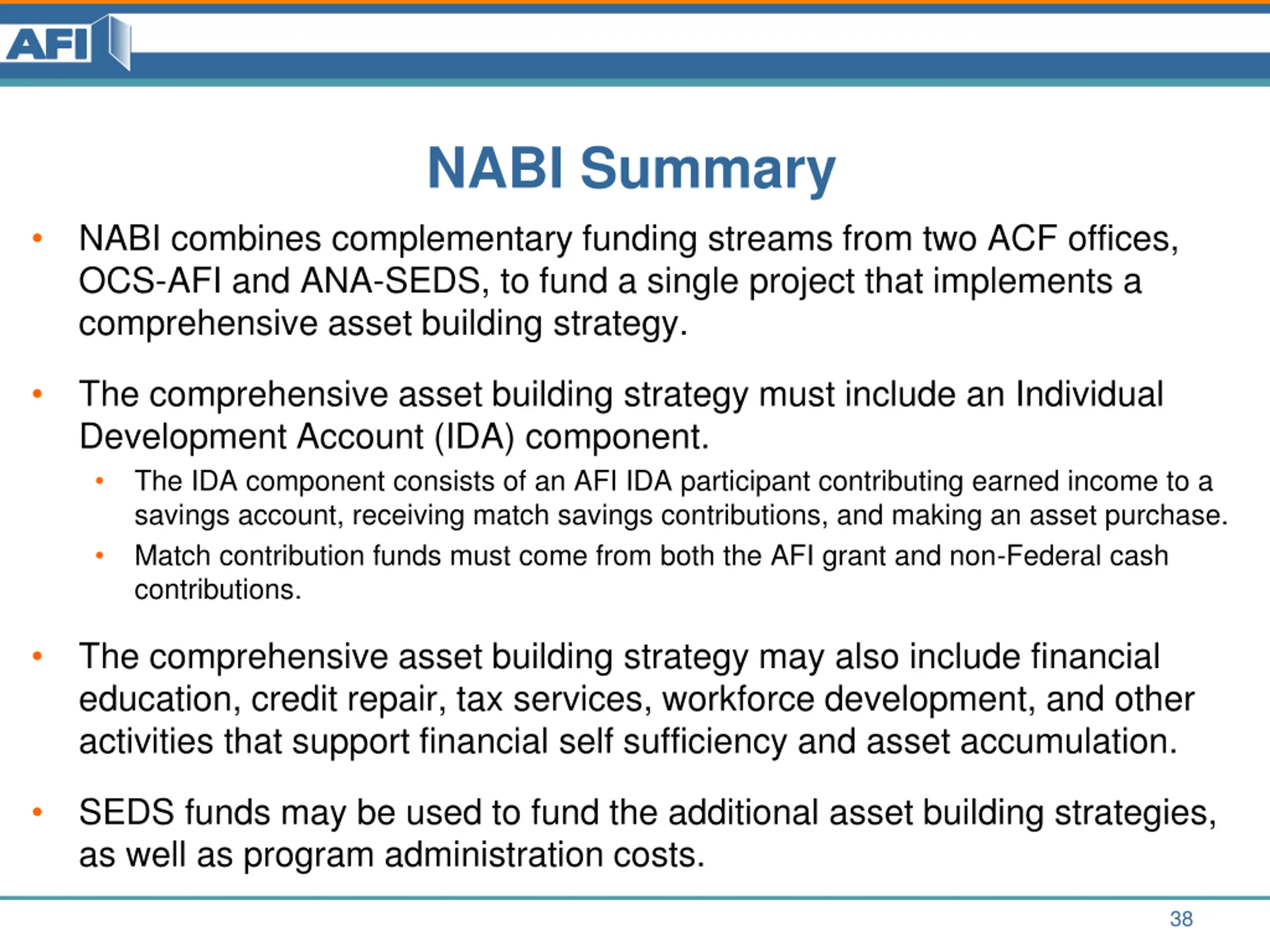 NABI Summary NABI combines complementary funding streams from two ACF offices, OCS-AFI and ANA-SEDS, to fund a single project that implements a comprehensive asset building strategy. The comprehensive asset building strategy must include an Individual Development Account (IDA) component. The IDA component consists of an AFI IDA participant contributing earned income to a savings account, receiving match savings contributions, and making an asset purchase. Match contribution funds must come from both the AFI grant and non-Federal cash contributions. The comprehensive asset building strategy may also include financial education, credit repair, tax services, workforce development, and other activities that support financial self sufficiency and asset accumulation. SEDS funds may be used to fund the additional asset building strategies, as well as program administration costs. 38