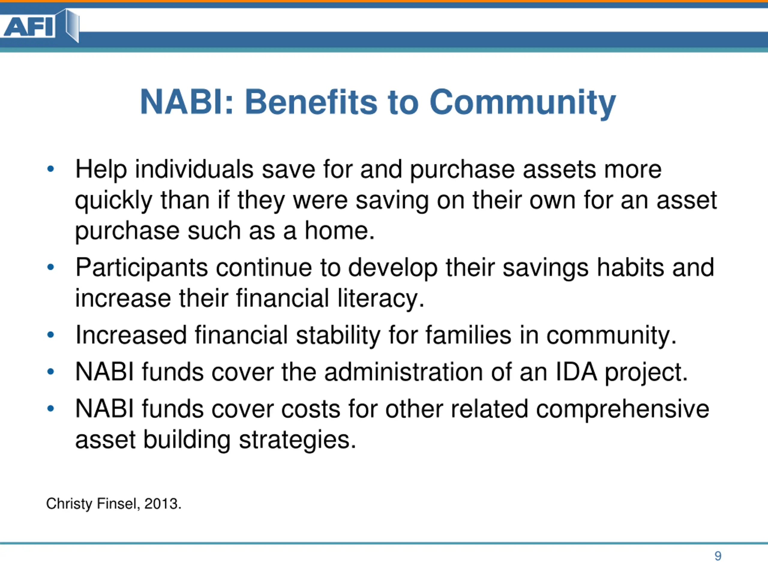NABI: Benefits to Community Help individuals save for and purchase assets more quickly than if they were saving on their own for an asset purchase such as a home. Participants continue to develop their savings habits and increase their financial literacy. Increased financial stability for families in community. NABI funds cover the administration of an IDA project. NABI funds cover costs for other related comprehensive asset building strategies. Christy Finsel, 2013. 9