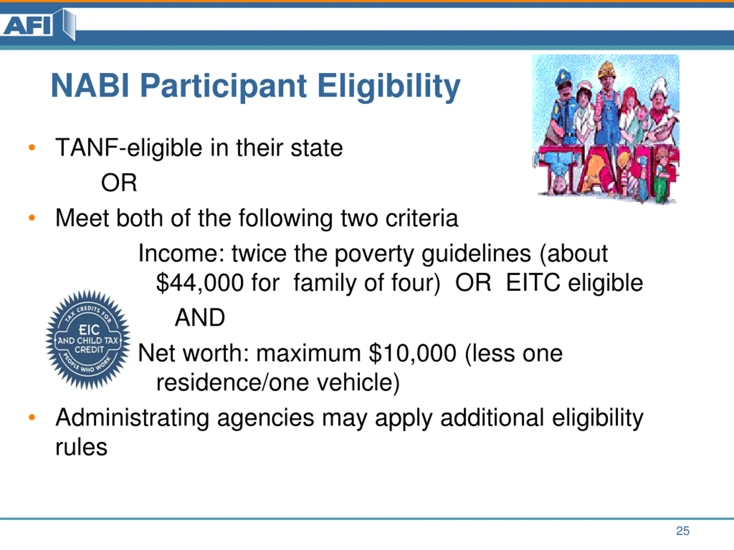 NABI Participant Eligibility TANF-eligible in their state OR Meet both of the following two criteria Income: twice the poverty guidelines (about $44,000 for family of four) OR EITC eligible AND Net worth: maximum $10,000 (less one residence/one vehicle) Administrating agencies may apply additional eligibility rules 25