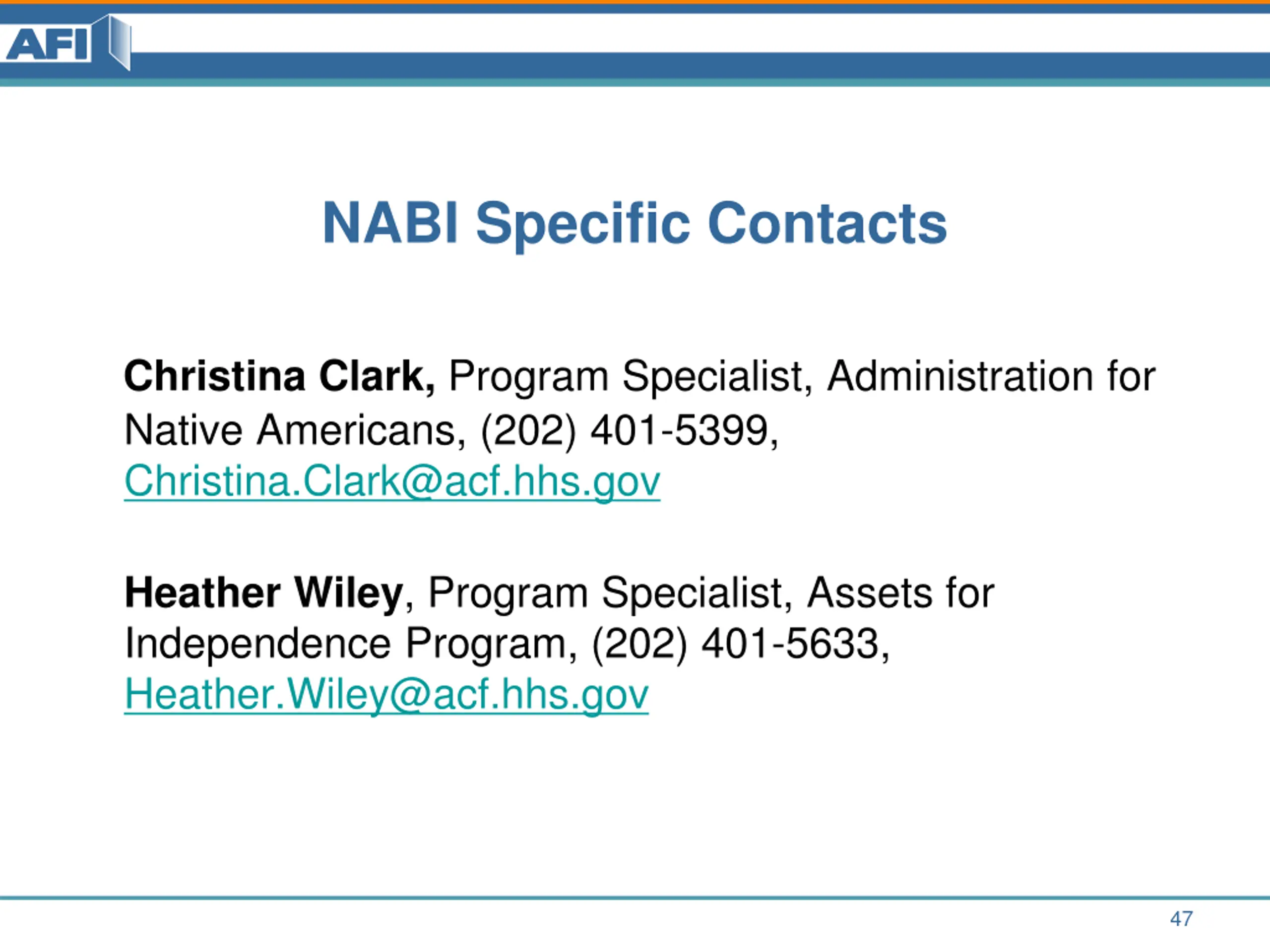 NABI Specific Contacts Christina Clark, Program Specialist, Administration for Native Americans, (202) 401-5399, Christina.Clark@acf.hhs.gov Heather Wiley, Program Specialist, Assets for Independence Program, (202) 401-5633, Heather.Wiley@acf.hhs.gov 47