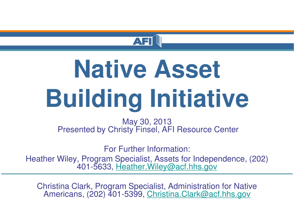 Native Asset Building Initiative May 30, 2013 Presented by Christy Finsel, AFI Resource Center For Further Information: Heather Wiley, Program Specialist, Assets for Independence, (202) 401-5633, Heather.Wiley@acf.hhs.gov Christina Clark, Program Specialist, Administration for Native Americans, (202) 401-5399, Christina.Clark@acf.hhs.gov