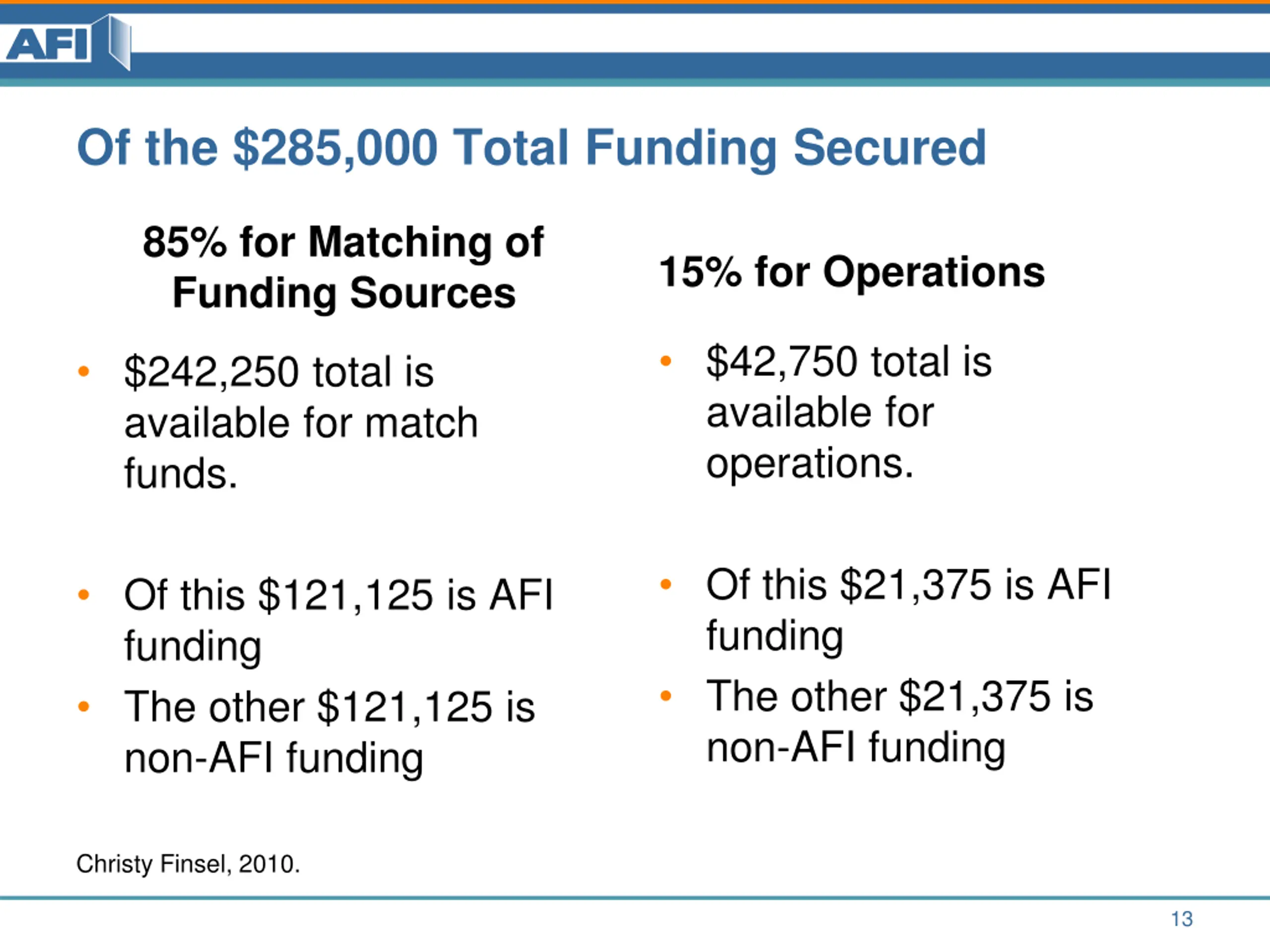 Of the $285,000 Total Funding Secured 85% for Matching of Funding Sources 15% for Operations $42,750 total is available for operations. $242,250 total is available for match funds. Of this $21,375 is AFI funding The other $21,375 is non-AFI funding Of this $121,125 is AFI funding The other $121,125 is non-AFI funding Christy Finsel, 2010. 13