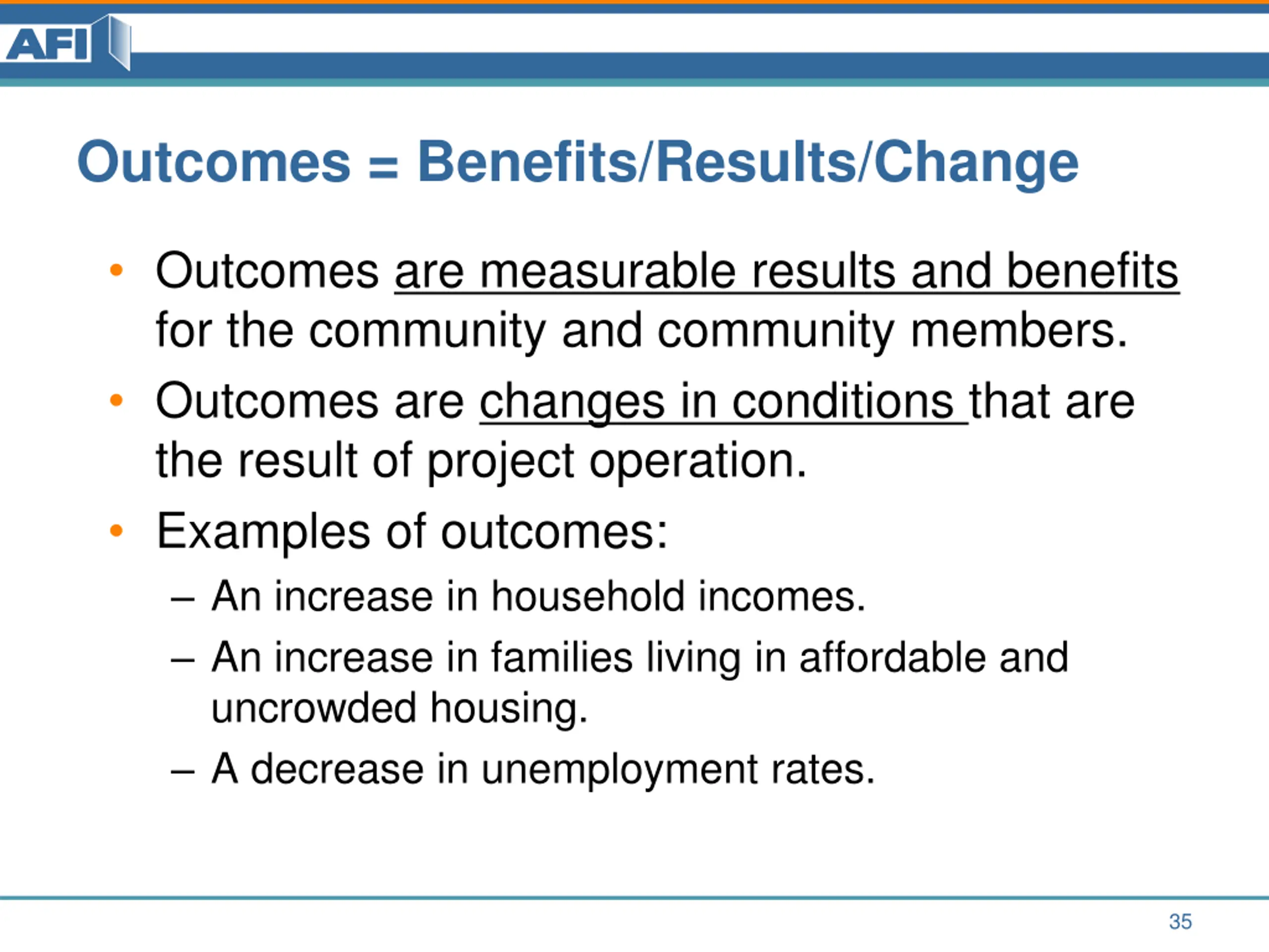 Outcomes = Benefits/Results/Change Outcomes are measurable results and benefits for the community and community members. Outcomes are changes in conditions that are the result of project operation. Examples of outcomes: An increase in household incomes. An increase in families living in affordable and uncrowded housing. A decrease in unemployment rates. 35