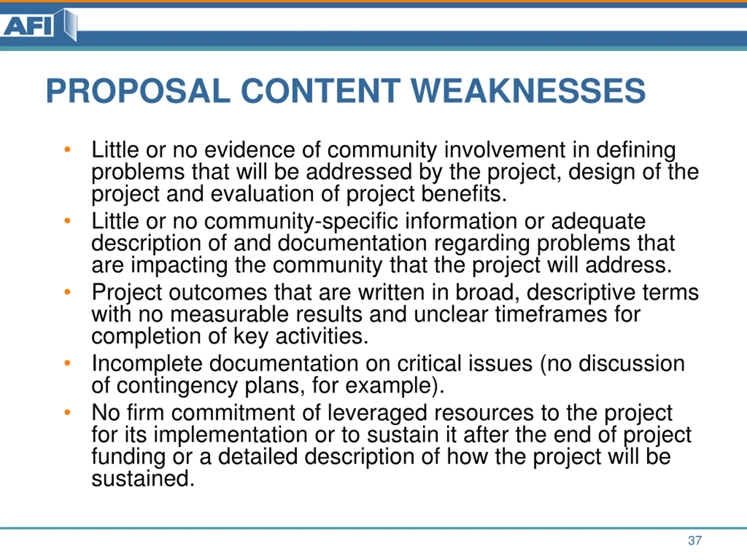 PROPOSAL CONTENT WEAKNESSES Little or no evidence of community involvement in defining problems that will be addressed by the project, design of the project and evaluation of project benefits. Little or no community-specific information or adequate description of and documentation regarding problems that are impacting the community that the project will address. Project outcomes that are written in broad, descriptive terms with no measurable results and unclear timeframes for completion of key activities. Incomplete documentation on critical issues (no discussion of contingency plans, for example). No firm commitment of leveraged resources to the project for its implementation or to sustain it after the end of project funding or a detailed description of how the project will be sustained. 37