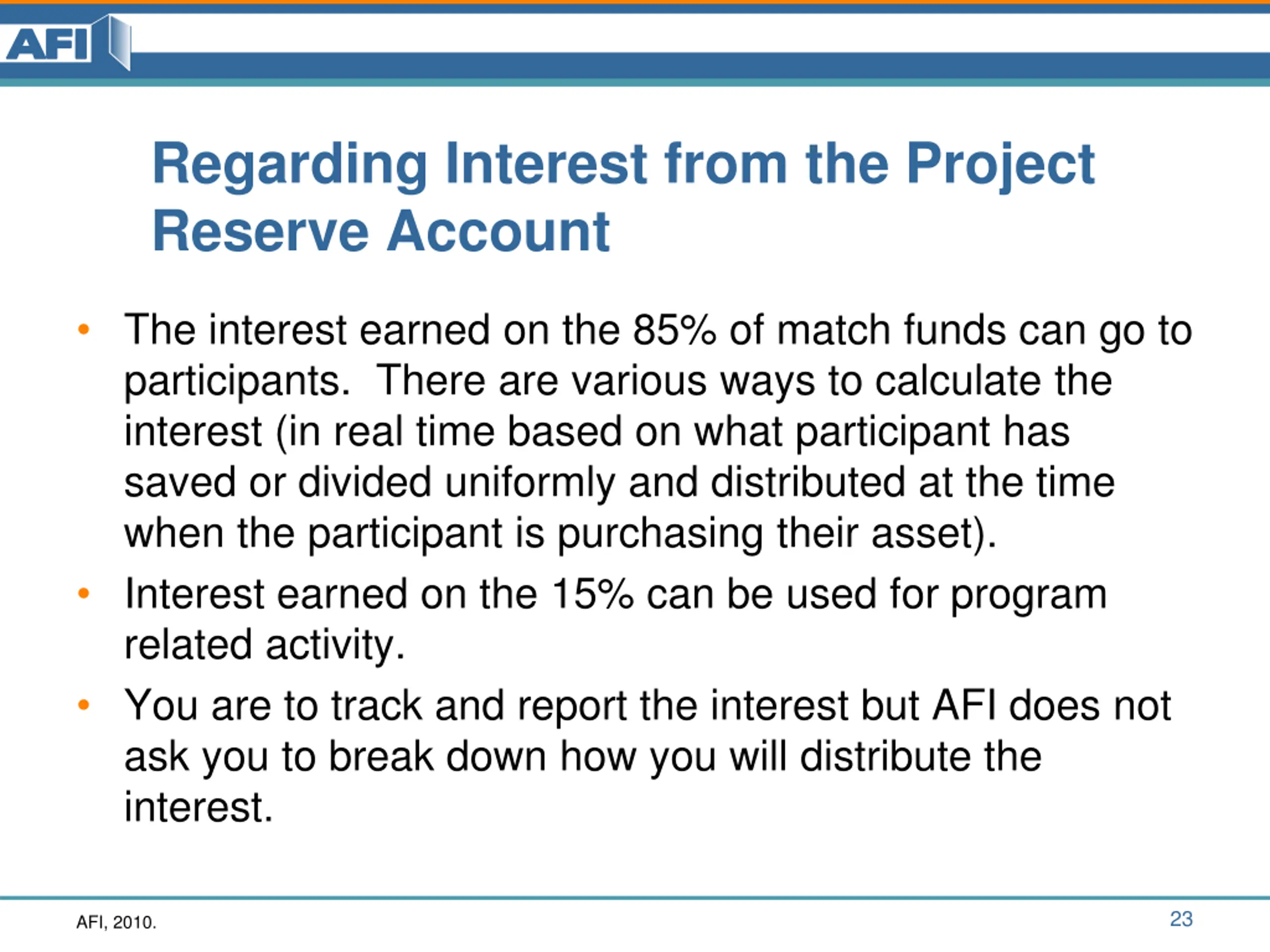 Regarding Interest from the Project Reserve Account The interest earned on the 85% of match funds can go to participants. There are various ways to calculate the interest (in real time based on what participant has saved or divided uniformly and distributed at the time when the participant is purchasing their asset). Interest earned on the 15% can be used for program related activity. You are to track and report the interest but AFI does not ask you to break down how you will distribute the interest. 23 AFI, 2010.