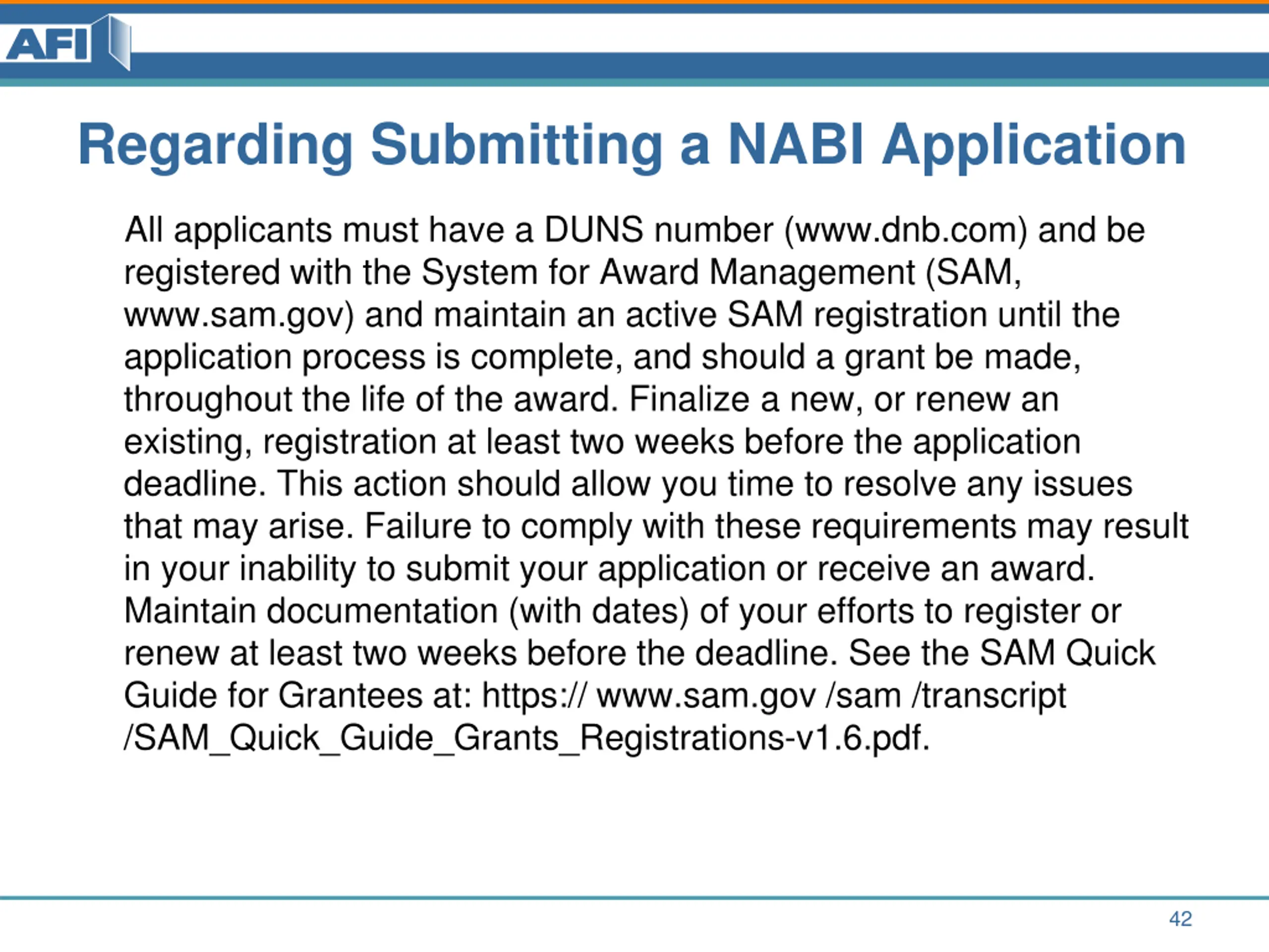 Regarding Submitting a NABI Application All applicants must have a DUNS number (www.dnb.com) and be registered with the System for Award Management (SAM, www.sam.gov) and maintain an active SAM registration until the application process is complete, and should a grant be made, throughout the life of the award. Finalize a new, or renew an existing, registration at least two weeks before the application deadline. This action should allow you time to resolve any issues that may arise. Failure to comply with these requirements may result in your inability to submit your application or receive an award. Maintain documentation (with dates) of your efforts to register or renew at least two weeks before the deadline. See the SAM Quick Guide for Grantees at: https:// www.sam.gov /sam /transcript /SAM_Quick_Guide_Grants_Registrations-v1.6.pdf. 42