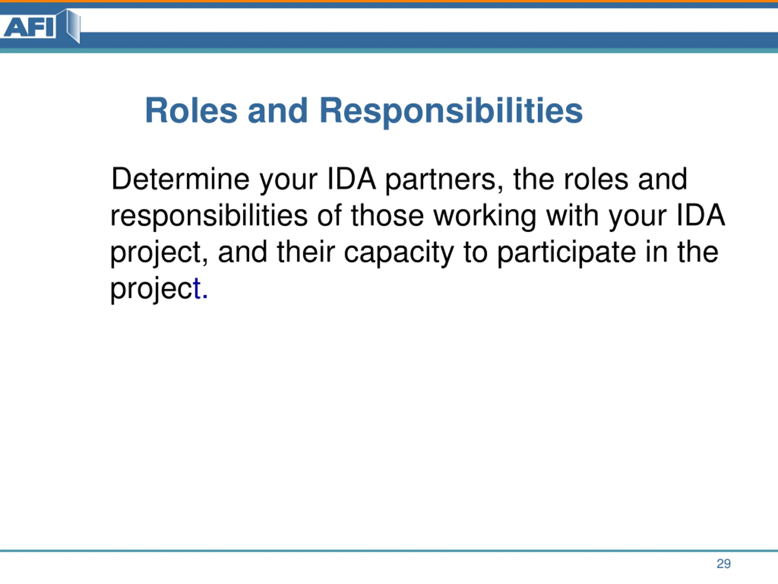 Roles and Responsibilities Determine your IDA partners, the roles and responsibilities of those working with your IDA project, and their capacity to participate in the project. 29