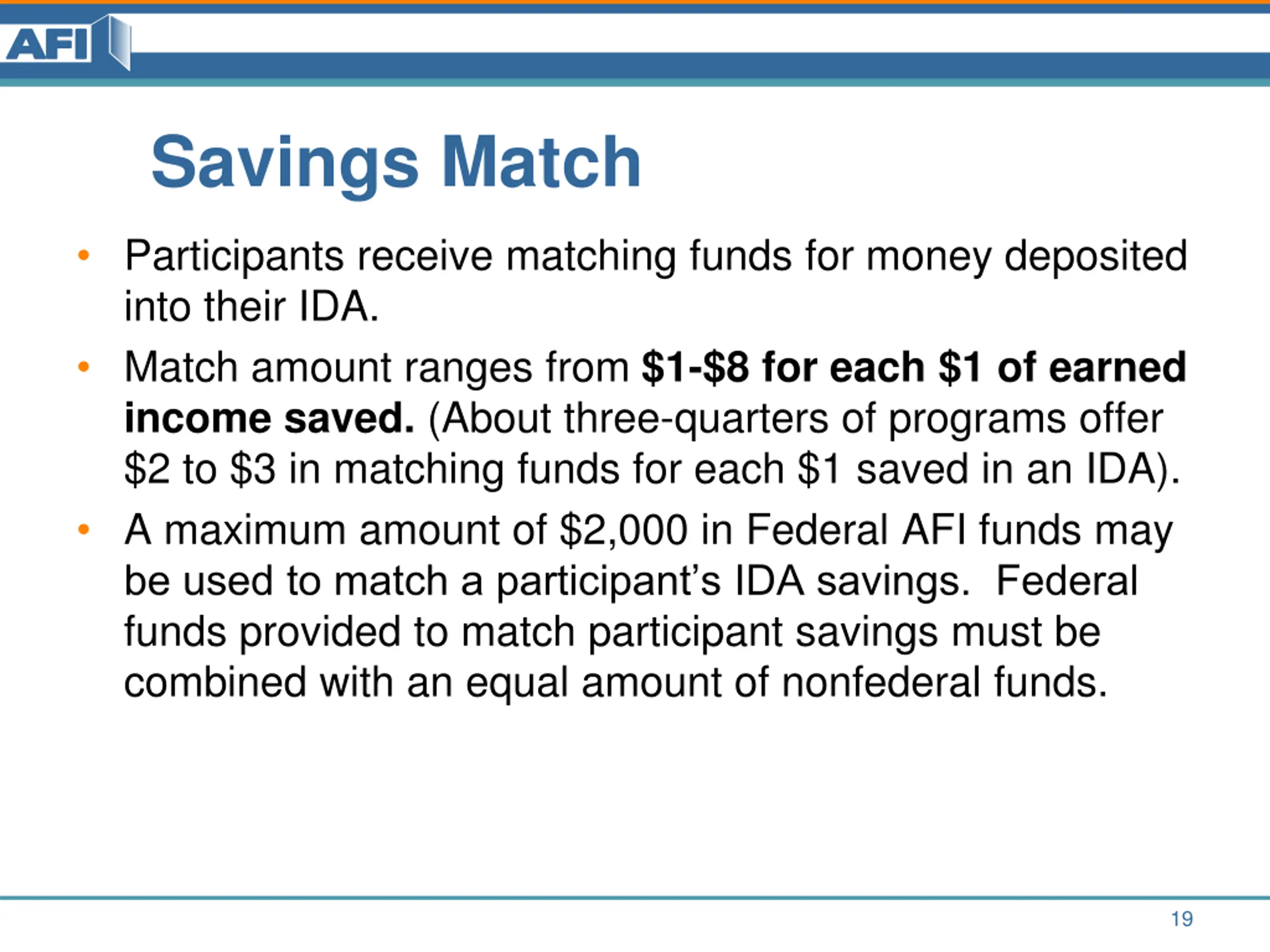 Savings Match Participants receive matching funds for money deposited into their IDA. Match amount ranges from $1-$8 for each $1 of earned income saved. (About three-quarters of programs offer $2 to $3 in matching funds for each $1 saved in an IDA). A maximum amount of $2,000 in Federal AFI funds may be used to match a participant s IDA savings. Federal funds provided to match participant savings must be combined with an equal amount of nonfederal funds. 19