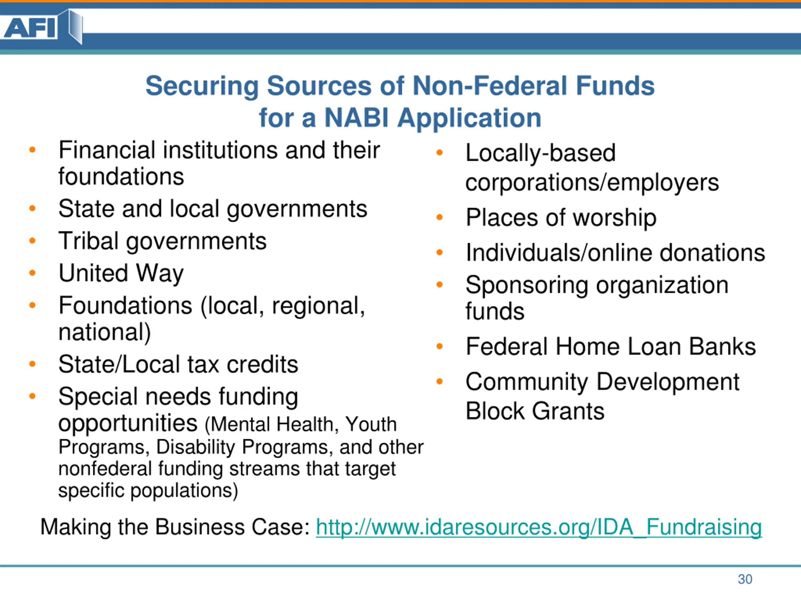 Securing Sources of Non-Federal Funds for a NABI Application Financial institutions and their foundations State and local governments Tribal governments United Way Foundations (local, regional, national) State/Local tax credits Special needs funding opportunities (Mental Health, Youth Programs, Disability Programs, and other nonfederal funding streams that target specific populations) Locally-based corporations/employers Places of worship Individuals/online donations Sponsoring organization funds Federal Home Loan Banks Community Development Block Grants Making the Business Case: http://www.idaresources.org/IDA_Fundraising 30