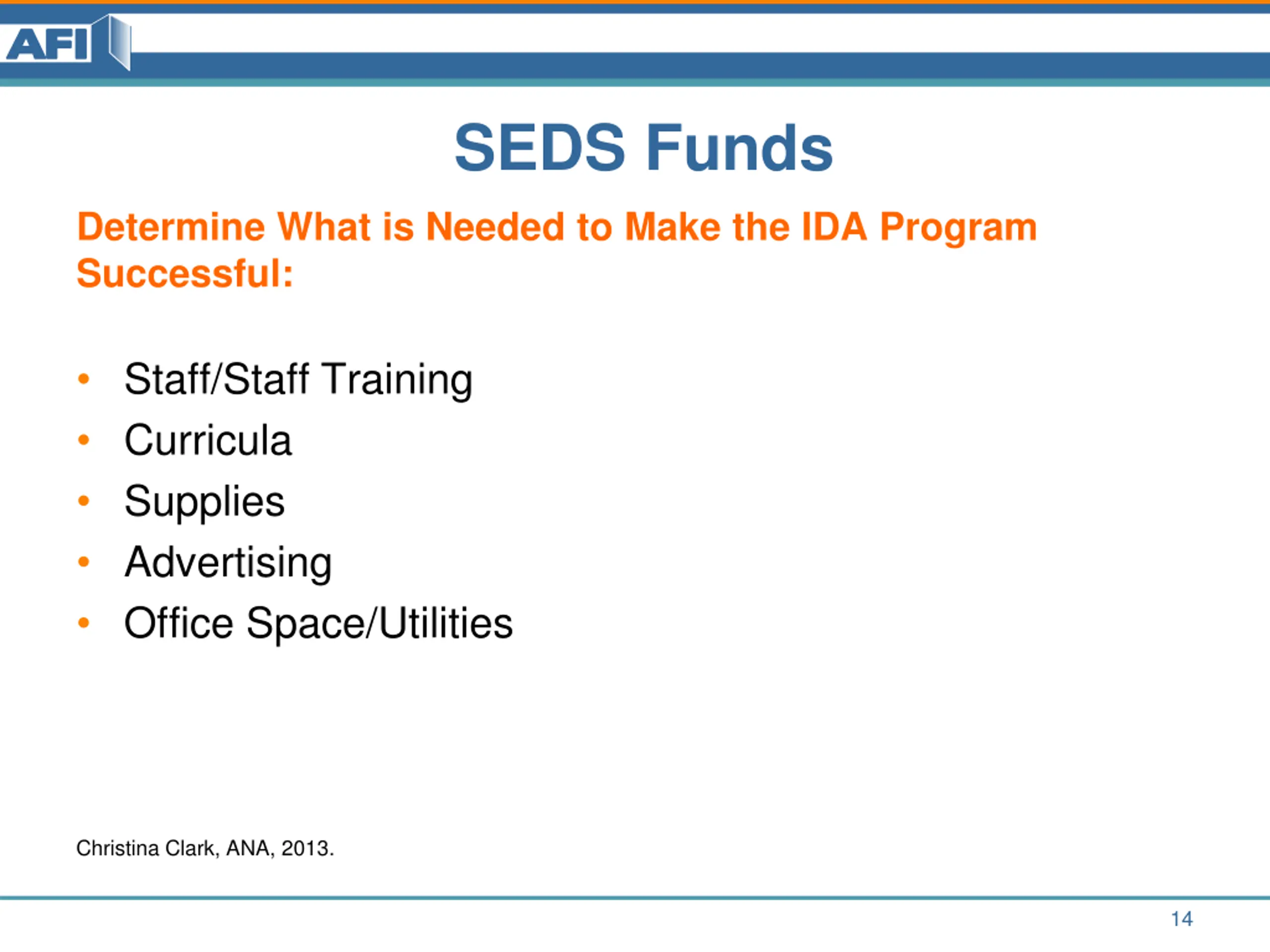 SEDS Funds Determine What is Needed to Make the IDA Program Successful: Staff/Staff Training Curricula Supplies Advertising Office Space/Utilities Christina Clark, ANA, 2013. 14