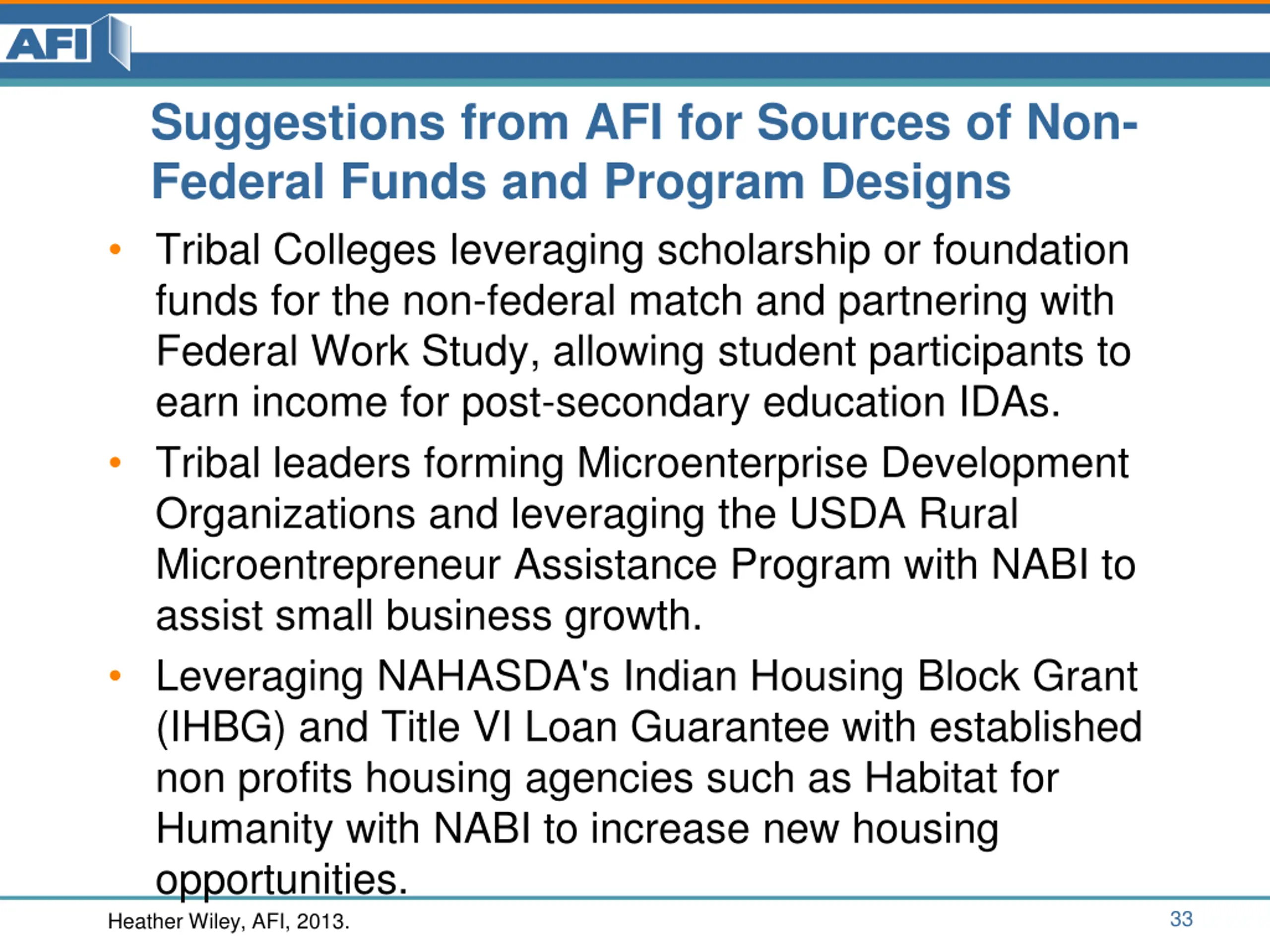 Suggestions from AFI for Sources of Non- Federal Funds and Program Designs Tribal Colleges leveraging scholarship or foundation funds for the non-federal match and partnering with Federal Work Study, allowing student participants to earn income for post-secondary education IDAs. Tribal leaders forming Microenterprise Development Organizations and leveraging the USDA Rural Microentrepreneur Assistance Program with NABI to assist small business growth. Leveraging NAHASDA's Indian Housing Block Grant (IHBG) and Title VI Loan Guarantee with established non profits housing agencies such as Habitat for Humanity with NABI to increase new housing opportunities. Heather Wiley, AFI, 2013. 33