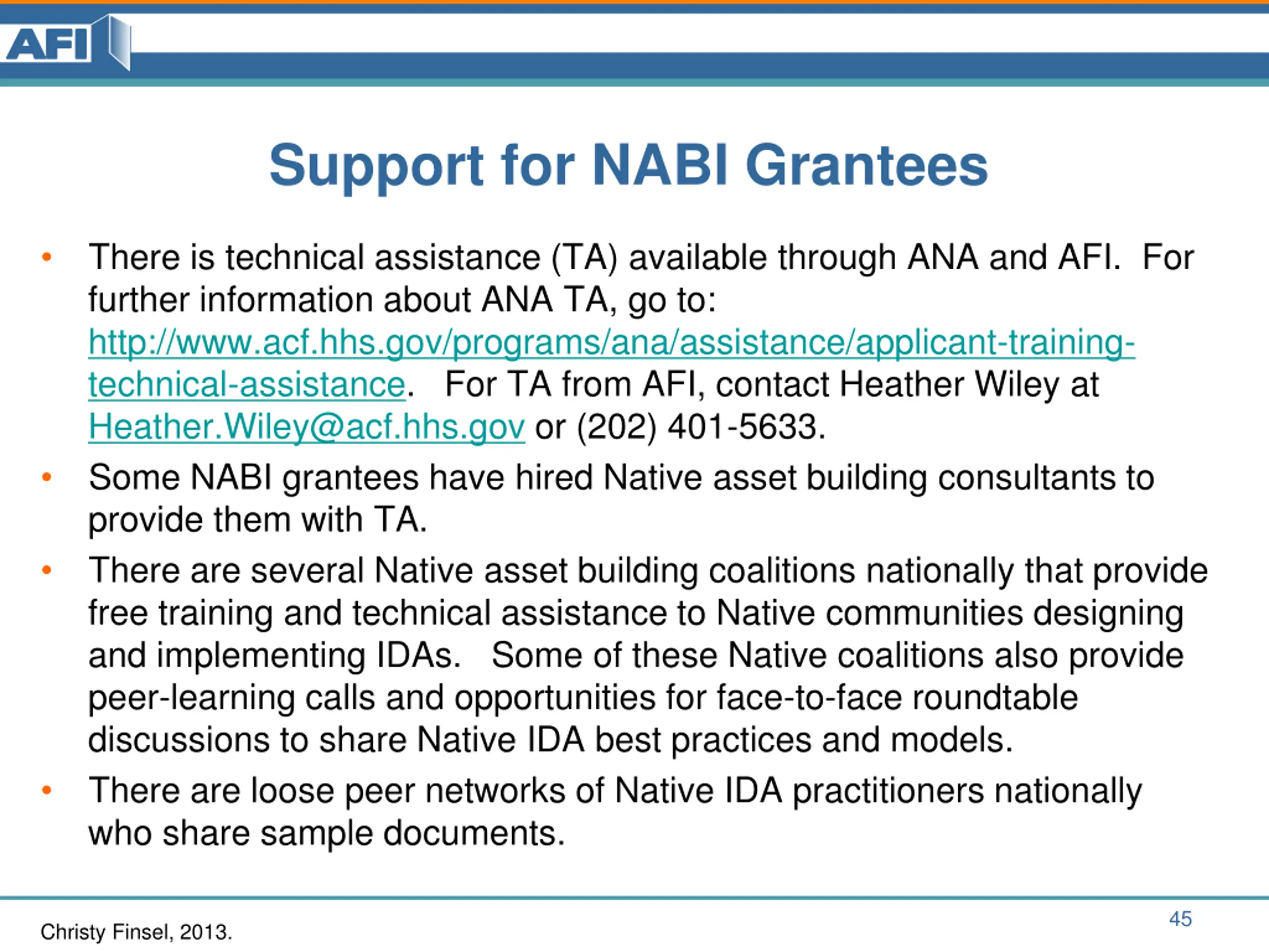 Support for NABI Grantees There is technical assistance (TA) available through ANA and AFI. For further information about ANA TA, go to: http://www.acf.hhs.gov/programs/ana/assistance/applicant-training- technical-assistance. For TA from AFI, contact Heather Wiley at Heather.Wiley@acf.hhs.gov or (202) 401-5633. Some NABI grantees have hired Native asset building consultants to provide them with TA. There are several Native asset building coalitions nationally that provide free training and technical assistance to Native communities designing and implementing IDAs. Some of these Native coalitions also provide peer-learning calls and opportunities for face-to-face roundtable discussions to share Native IDA best practices and models. There are loose peer networks of Native IDA practitioners nationally who share sample documents. 45 Christy Finsel, 2013.