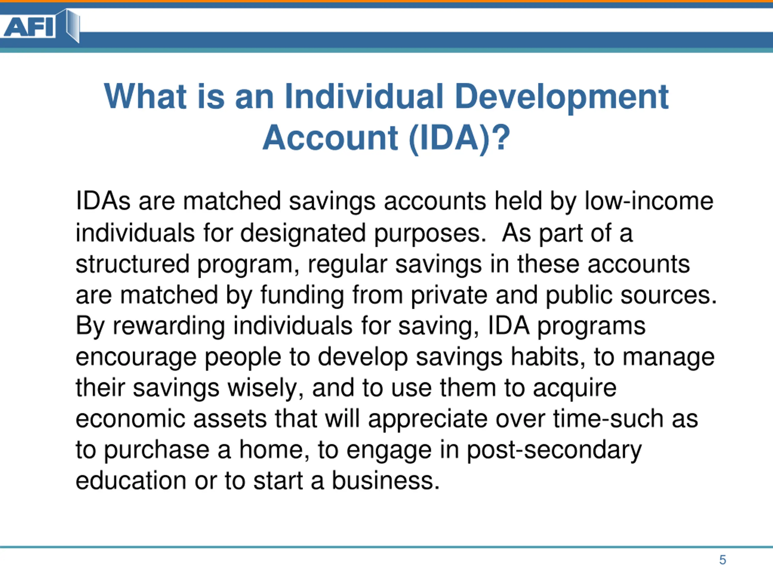 What is an Individual Development Account (IDA)? IDAs are matched savings accounts held by low-income individuals for designated purposes. As part of a structured program, regular savings in these accounts are matched by funding from private and public sources. By rewarding individuals for saving, IDA programs encourage people to develop savings habits, to manage their savings wisely, and to use them to acquire economic assets that will appreciate over time-such as to purchase a home, to engage in post-secondary education or to start a business. 5