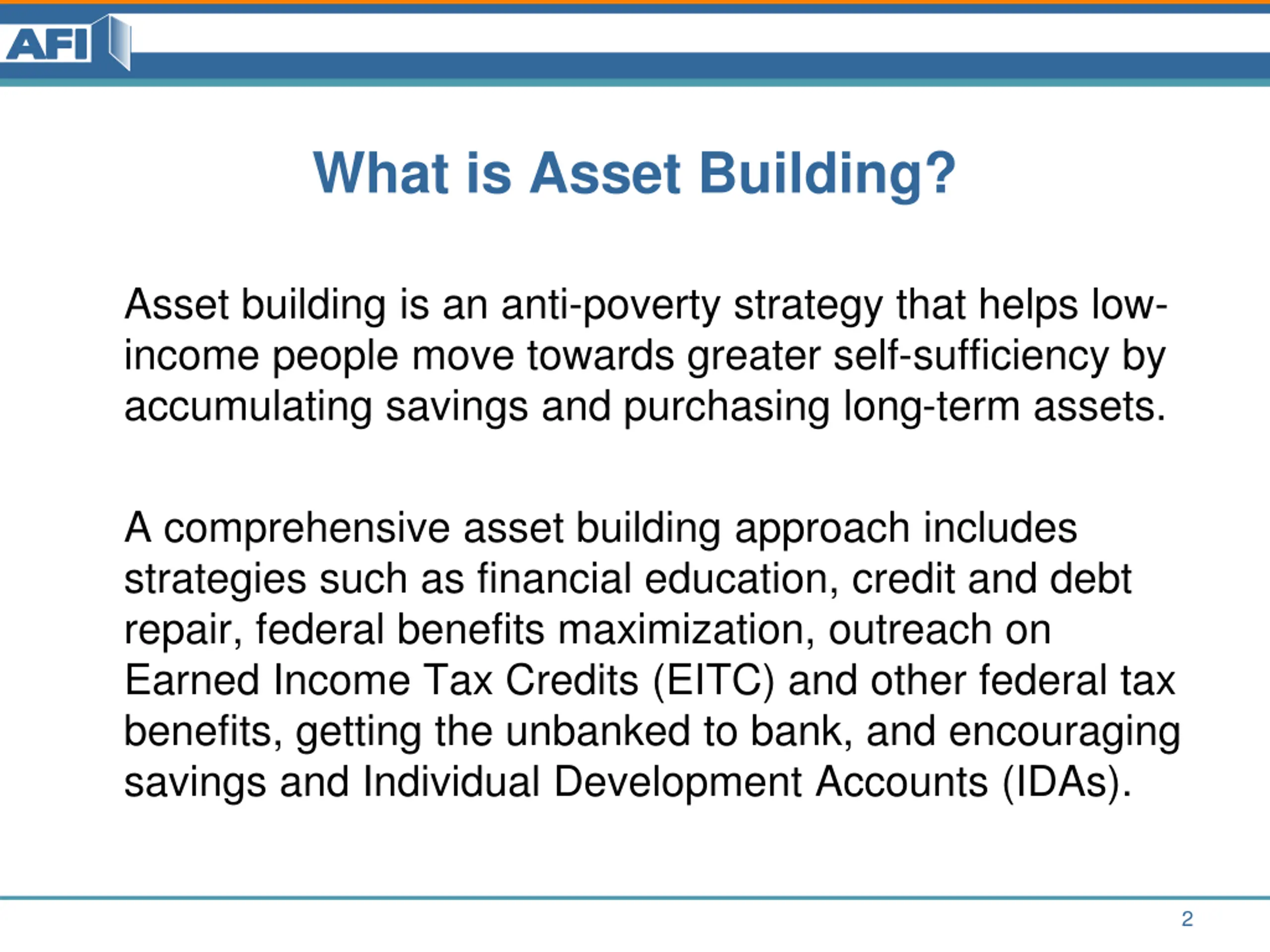 What is Asset Building? Asset building is an anti-poverty strategy that helps low- income people move towards greater self-sufficiency by accumulating savings and purchasing long-term assets. A comprehensive asset building approach includes strategies such as financial education, credit and debt repair, federal benefits maximization, outreach on Earned Income Tax Credits (EITC) and other federal tax benefits, getting the unbanked to bank, and encouraging savings and Individual Development Accounts (IDAs). 2